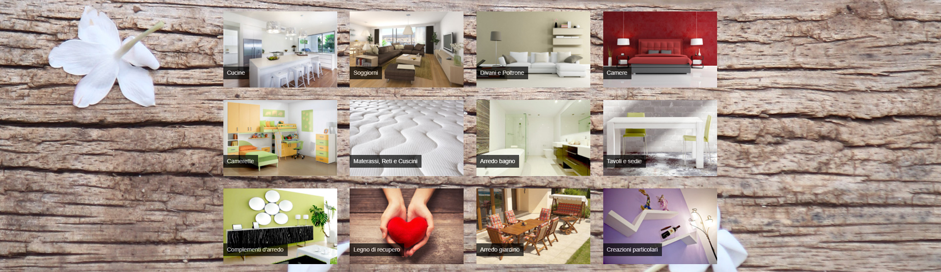 Scopri tutti i prodotti per arredare la tua casa: cucine e soggiorni su misura, divani e poltrone, camere e camerette su misura, materassi, reti e cuscini, arredo bagno, tavoli e sedie, complementi d’arredo, mobili con legno di recupero, arredo giardino, creazioni particolari.