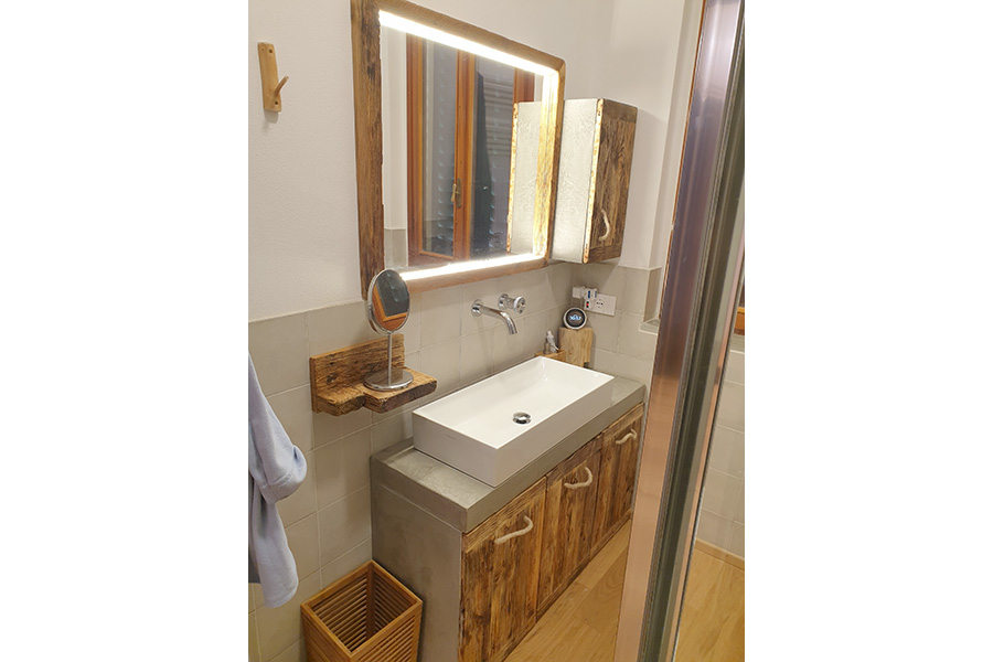 Questa realizzazione di arredo bagno si compone di un mobile bagno per il quale sono state realizzate le ante in legno di recupero, uno specchio con cornice sempre in legno vecchio posizionato sopra il mobile bagno ed un pensile verticale con anta in legno di recupero.