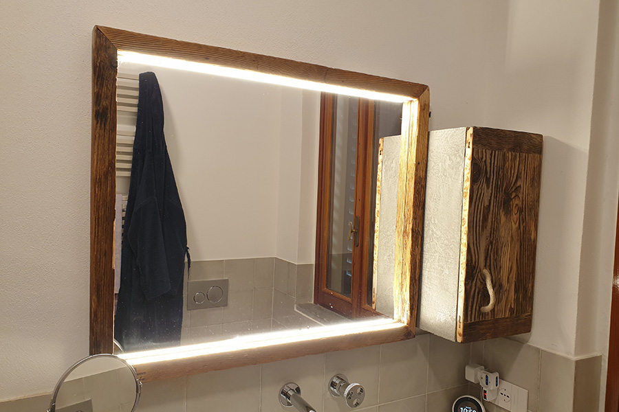 Due particolari di questa realizzazione: le maniglie in corda, e l’illuminazione led allo specchio.