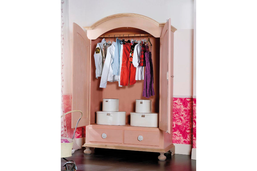 Questo armadio cameretta classico è verniciato di colore rosa, ma è disponibile anche in altri colori.
