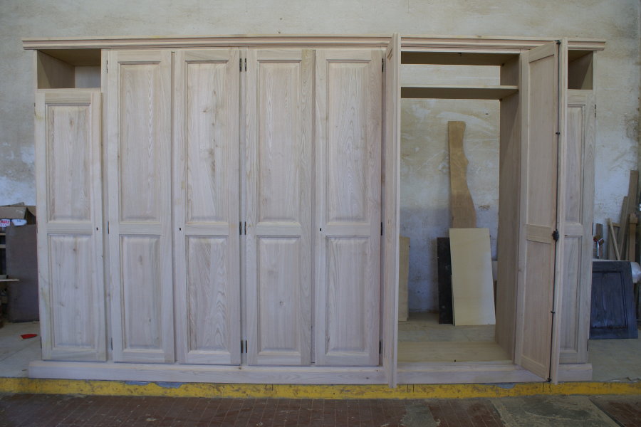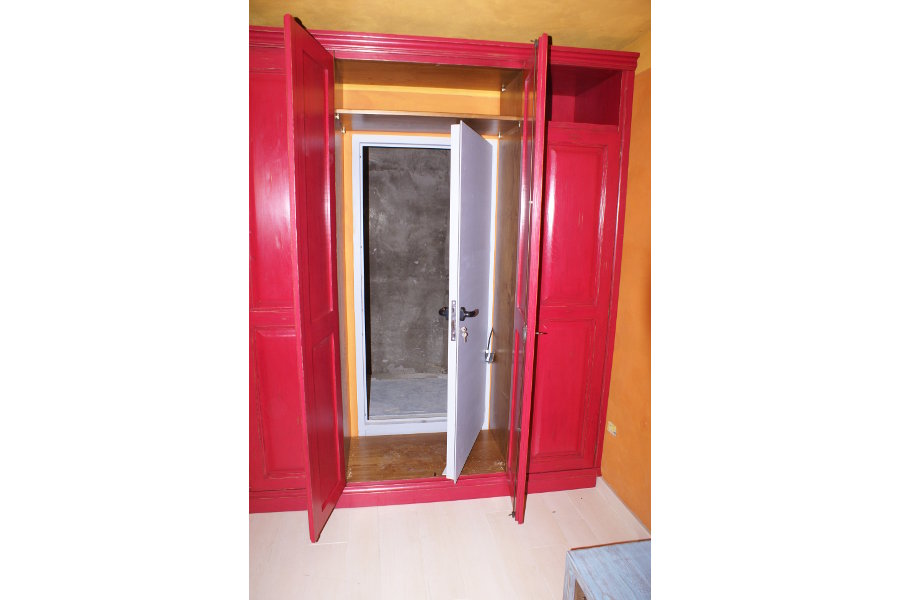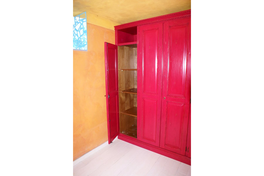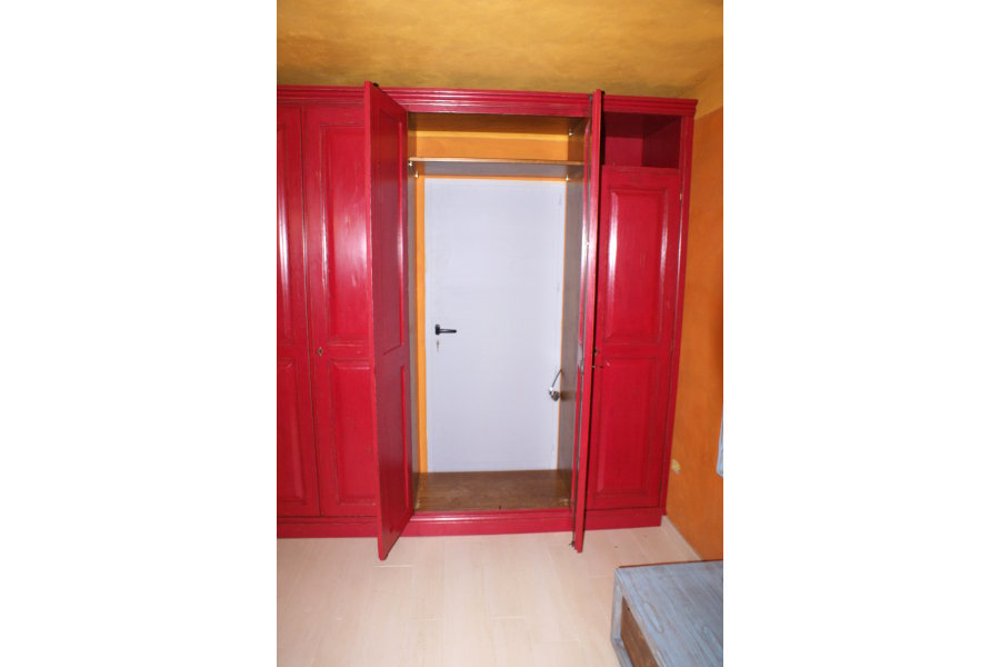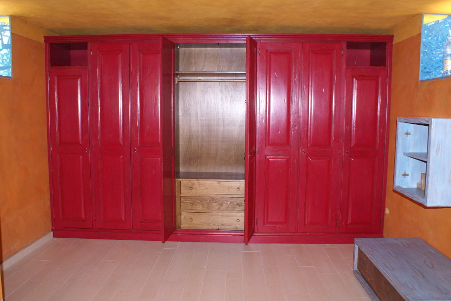 Realizzazione su misura di un armadio classico in legno massello di castagno decapato rosso. L’armadio nasconde un passaggio ed è predisposto per contenere casse audio. Possiamo realizzare questa struttura adattandola alla tua stanza, scegliendo la finitura di colore che preferisci.