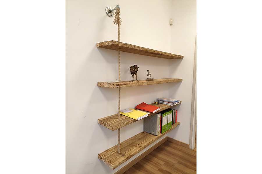 La libreria è costituita da 4 mensole di uguale dimensione, ovviamente sempre in legno vecchio, ma con l’inserimento della corda come sostegno agganciata alla parete tramite un gancio ad occhiello.
