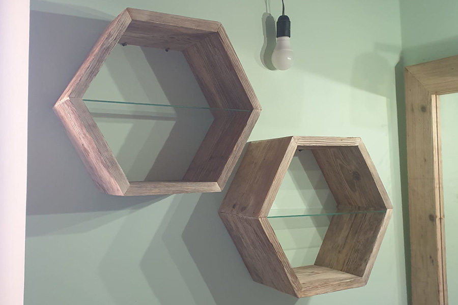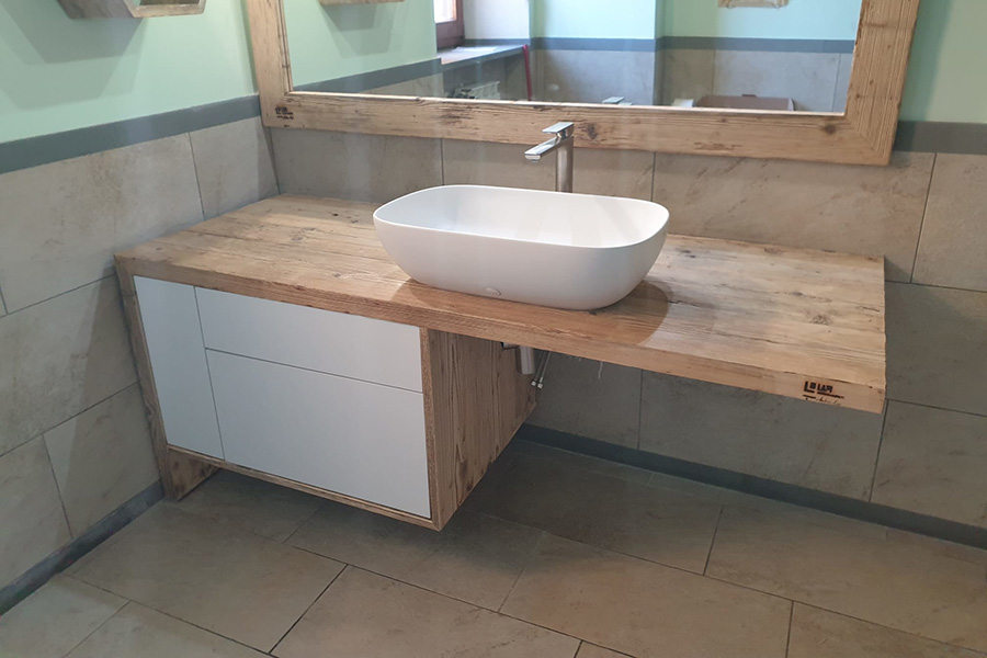 In questa composizione di arredo bagno in legno di recupero troviamo un mobile bagno completo di cassetti con lavabo bagno da appoggio e miscelatore, un grande specchio con cornice sempre in legno di recupero e due mensole esagonali della linea “Molecole”