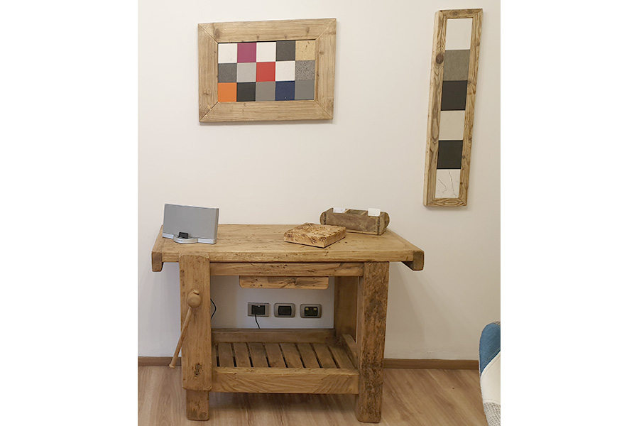 Completano l’arredamento di questo ufficio altri complementi d’arredo, quali quadretti in legno di recupero.