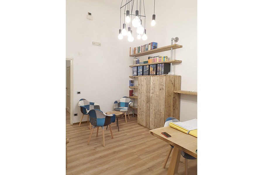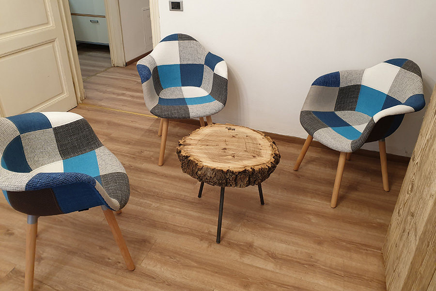 Particolarmente originale è un angolo destinato all’accoglienza clienti che è stato arredato semplicemente con delle poltroncine patchwork (disponibili in vari rivestimenti) e un tavolino ricavato da un tronco con gambe in ferro.