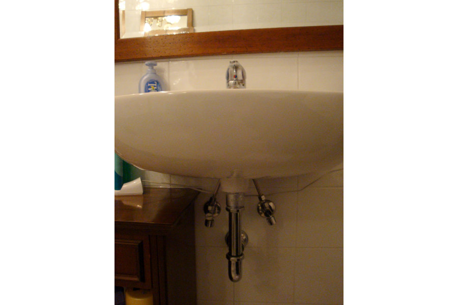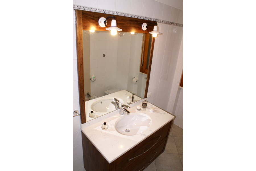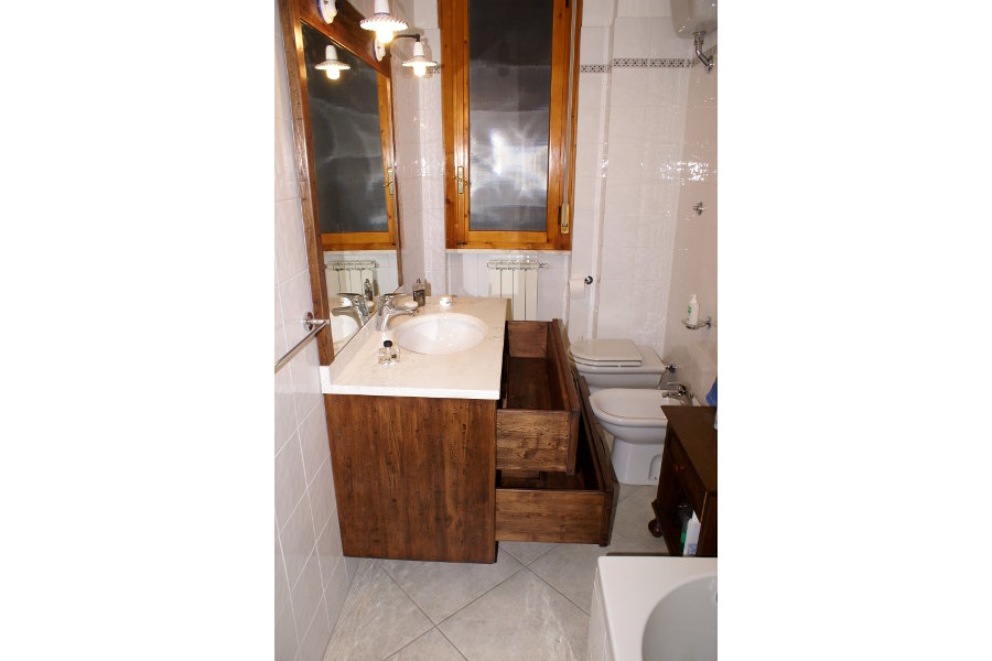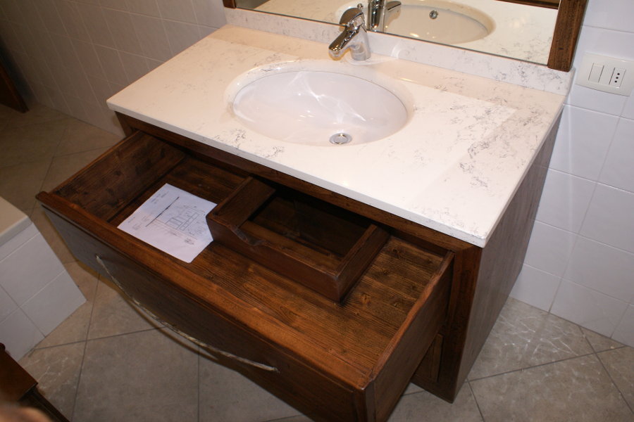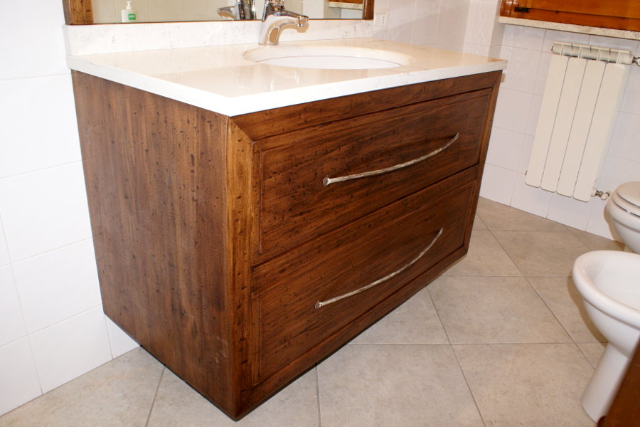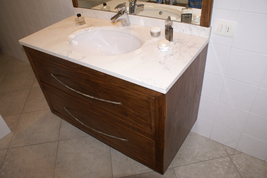 Realizzazione di un arredo bagno dalla linea moderna sospesa ma dal gusto classico. Il mobile è realizzato in legno massello con due cestoni contenitori estraibili, il piano è in quarzo, il lavabo in ceramica sotto top, il rubinetto è in acciaio cromo. La specchiera presenta luci in ceramica dipinte a mano. Possiamo realizzare mobili per il bagno su misura per il lavello già in tuo possesso.