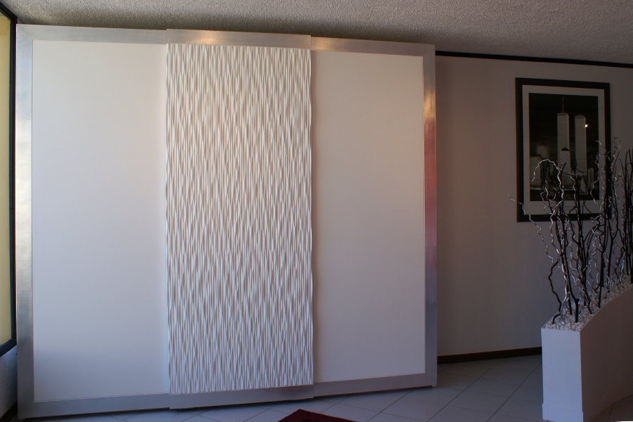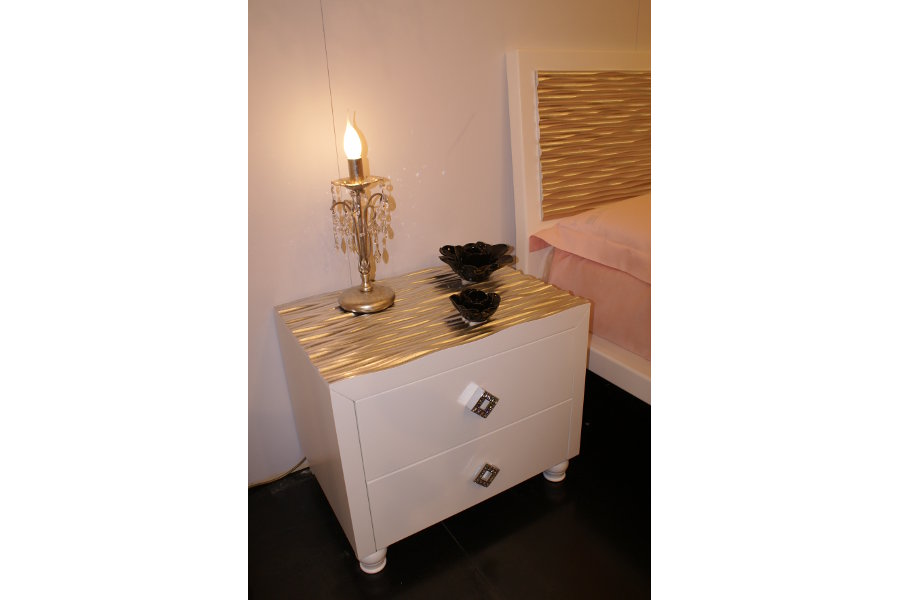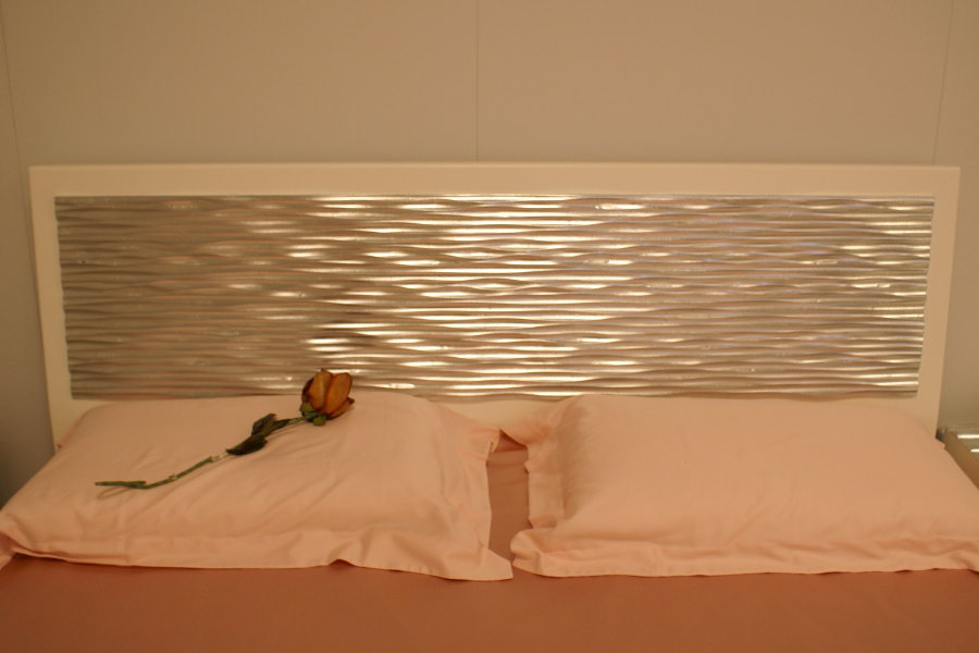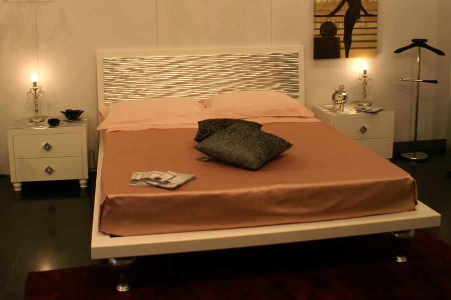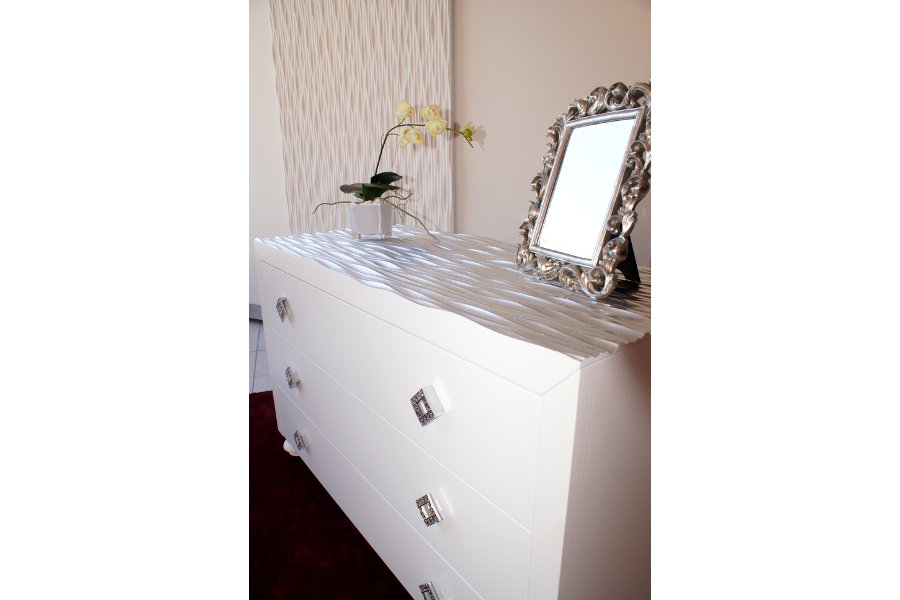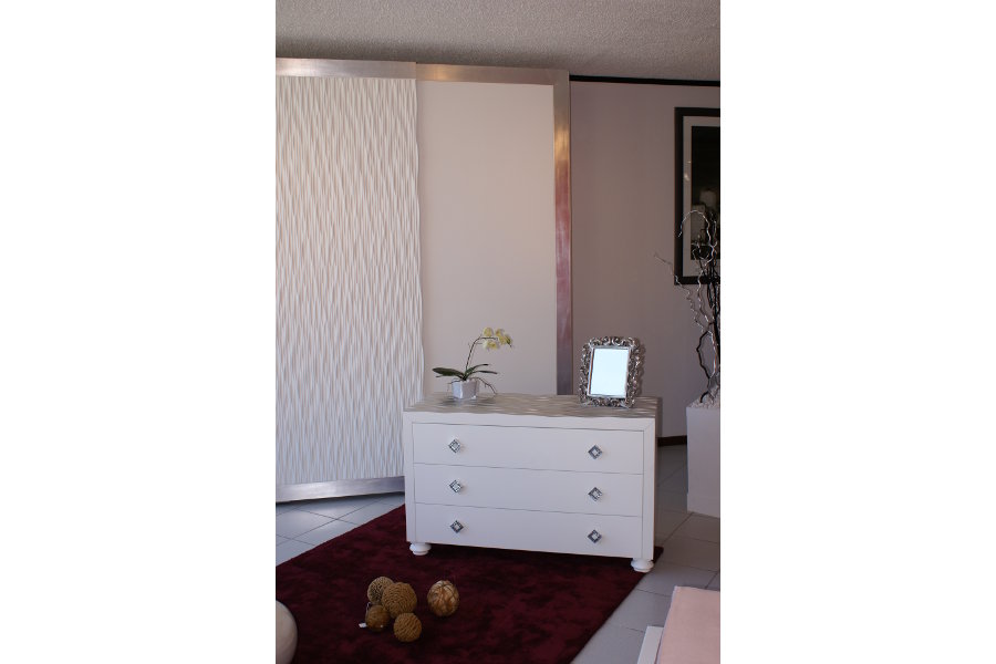 Camera moderna composta da letto, comodini, comò ed armadio ad ante scorrevoli. Il gruppo è caratterizzato dall’utilizzo di particolari pannelli con lavorazione laser in foglia argento, che donano movimento alla composizione. La tecnologia è al servizio dell’artigiano: Lapi Arredamenti unisce tecniche innovative e sapere antico per ottenere un prodotto nuovo e fuori dagli schemi. Le finiture possono essere molteplici e personalizzate secondo l’ambiente e le esigenze del cliente.