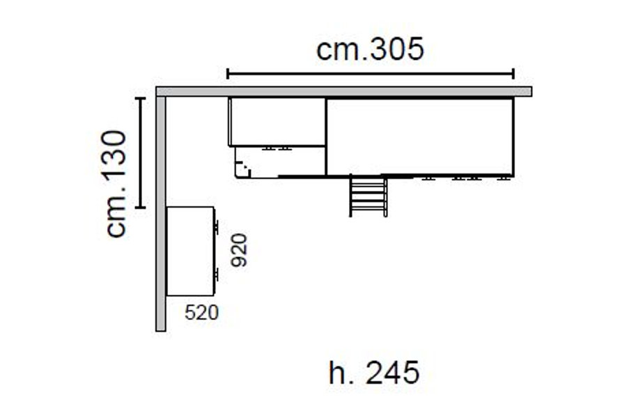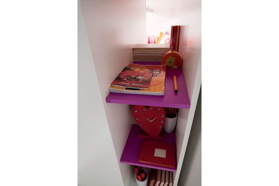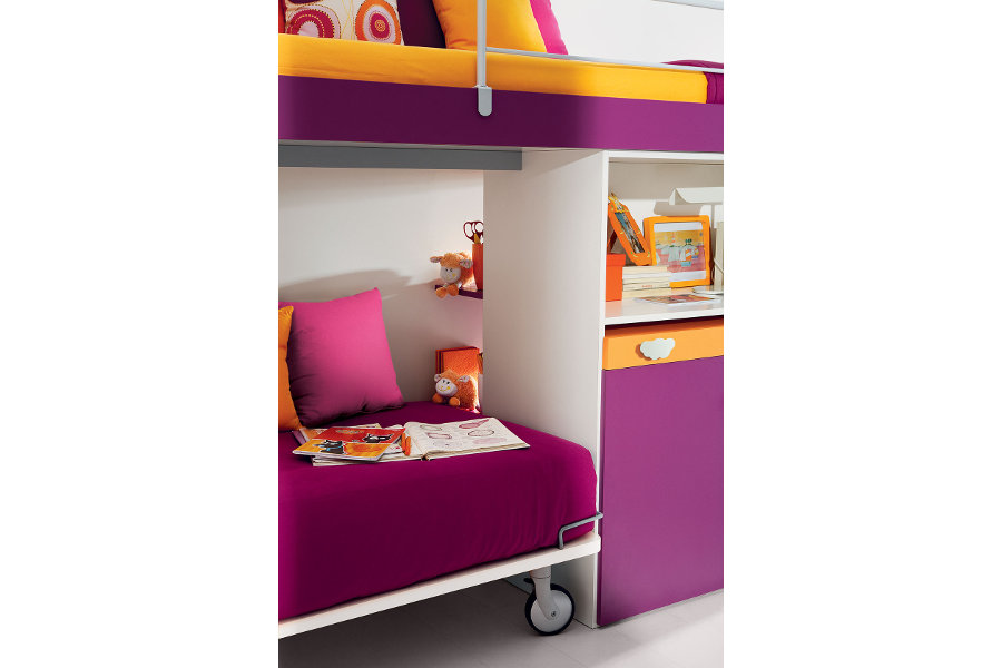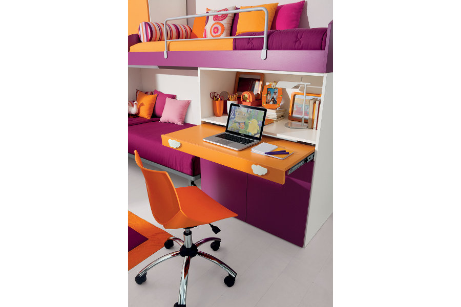 Cameretta moderna su misura, composta da una composizione ponte a soppalco, un letto con rete a doghe, una scaletta in metallo, un comò e una protezione in poliuretano. Gli elementi sono realizzati con pannelli in nobilitato melaminico su due lati, in finitura opaca di vari colori. La camera è interamente componibile e realizzabile su misura.