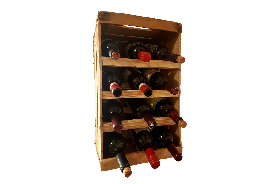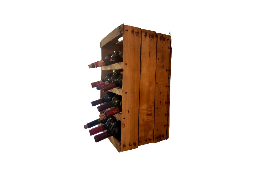 Originale cassetta da frutta portabottiglie, con una capienza di 12 bottiglie.