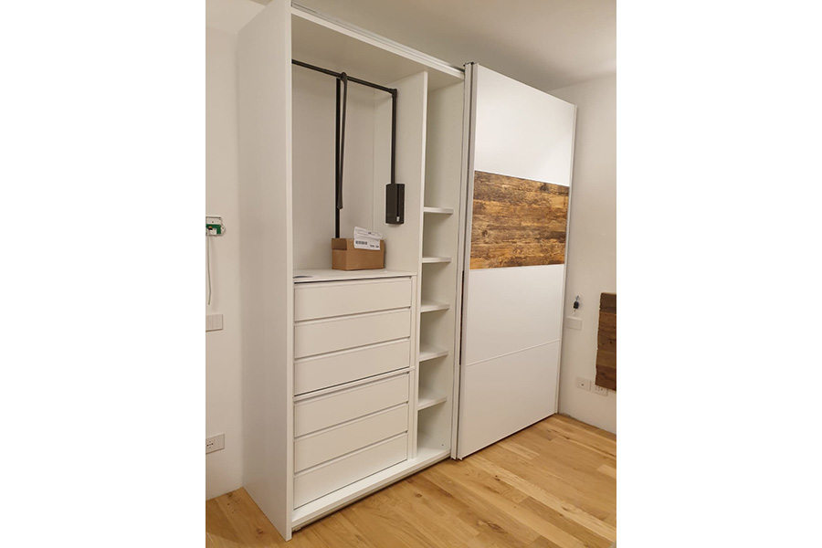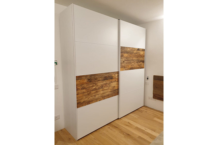 In abbinamento al comò, l’armadio in laminato bianco opaco, è stato personalizzato con due inserti in legno di recupero sulle ante scorrevoli.