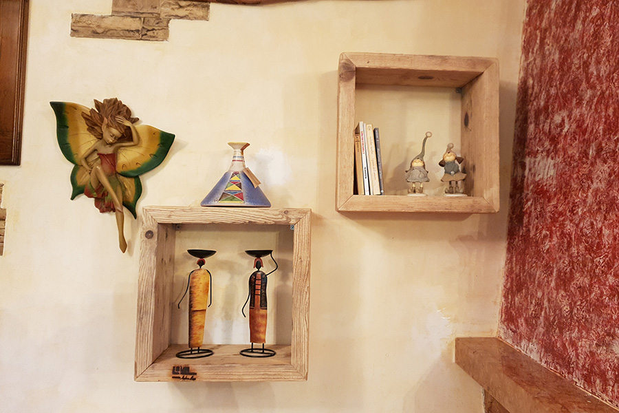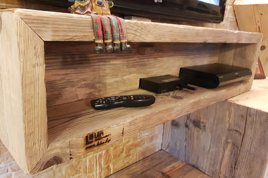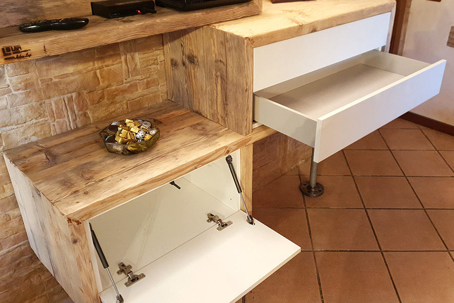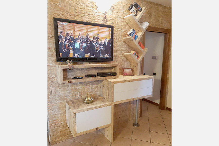 La composizione albero è composta da un ripiano porta decoder, due cassetti e un pensile con anta a ribalta, oltre che la libreria ad albero che può diventare anche portabottiglie, secondo le vostre esigenze. A completare il lavoro, due mensoline in legno di recupero.