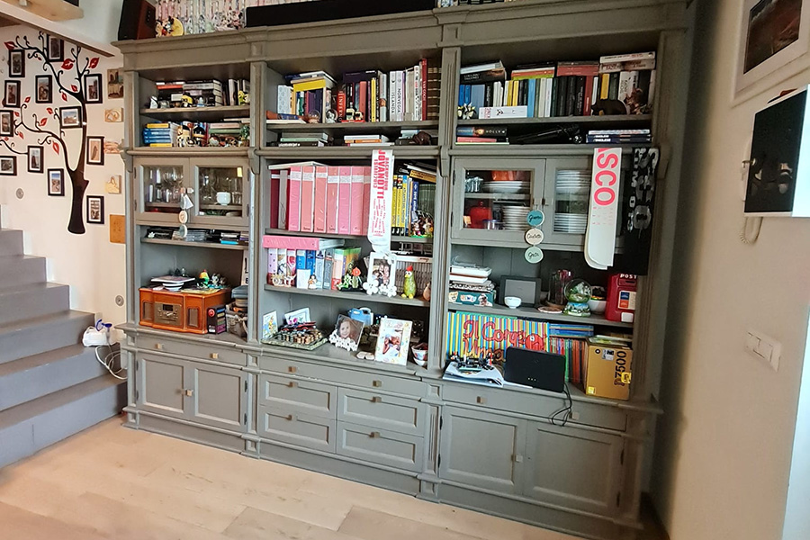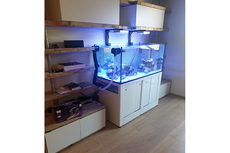 Abbiamo realizzato questa composizione in legno di recupero e ferro considerando lo spazio per l’acquario, precedentemente acquistato dai clienti, e che volevano una soluzione per incassarlo nel mobile.