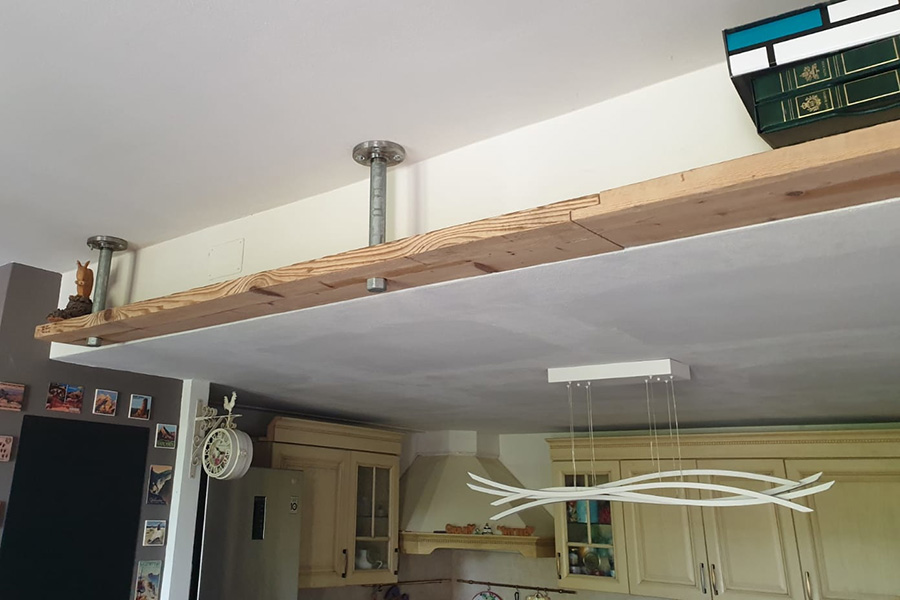 A completamento, dalla parte opposta della composizione, è stata realizzata una mensola in legno di recupero e tubi in metallo.