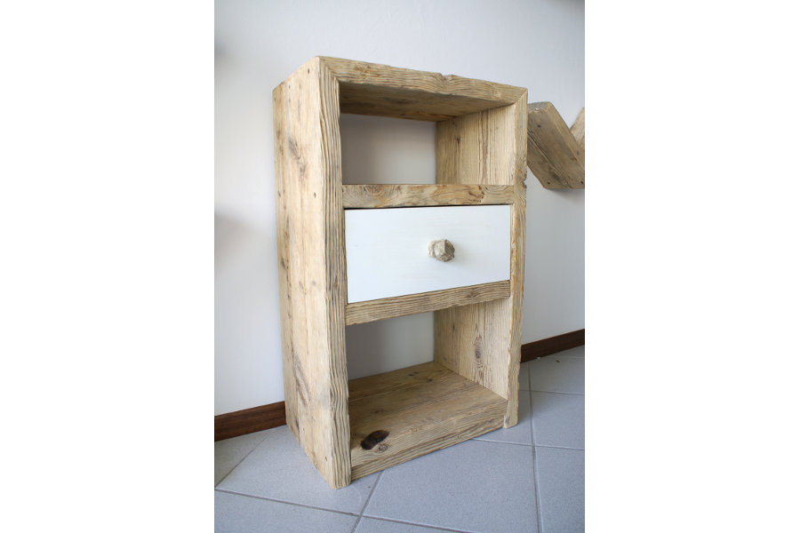 Particolare consolle su misura in legno di recupero con cassetto in laminato bianco. Questa consolle è alta 90 cm, ma può essere realizzata in varie misure.