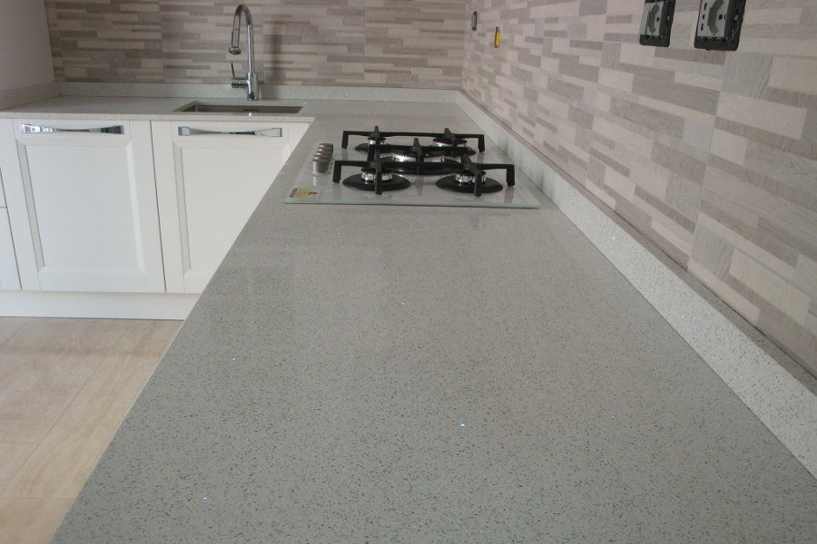 Il piano è in quarzo crystal, un materiale che non assorbe agenti chimici e macchie dei prodotti alimentari, e dona lucentezza a tutta la stanza.
