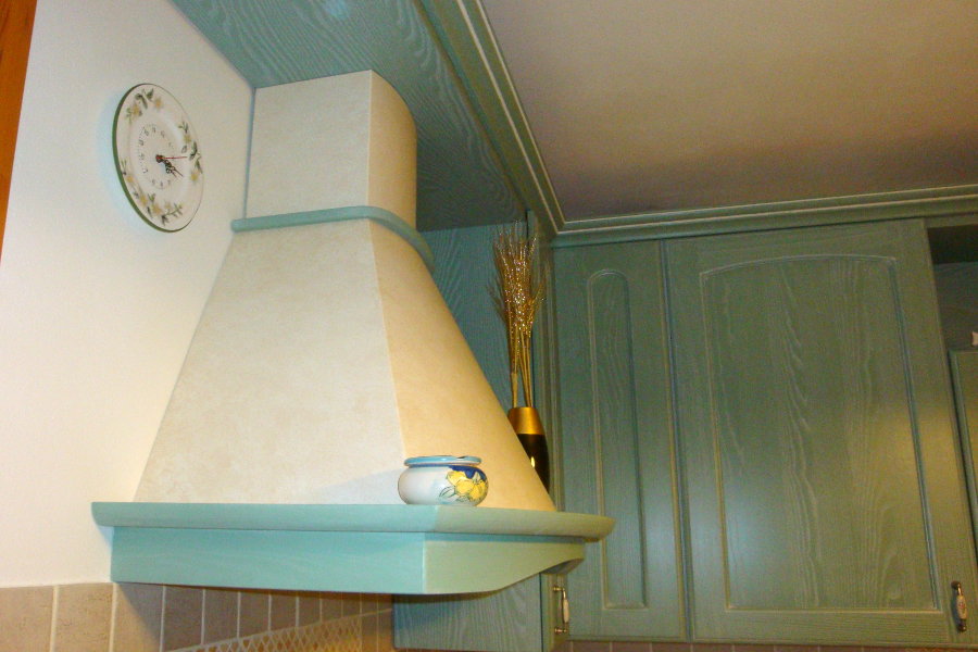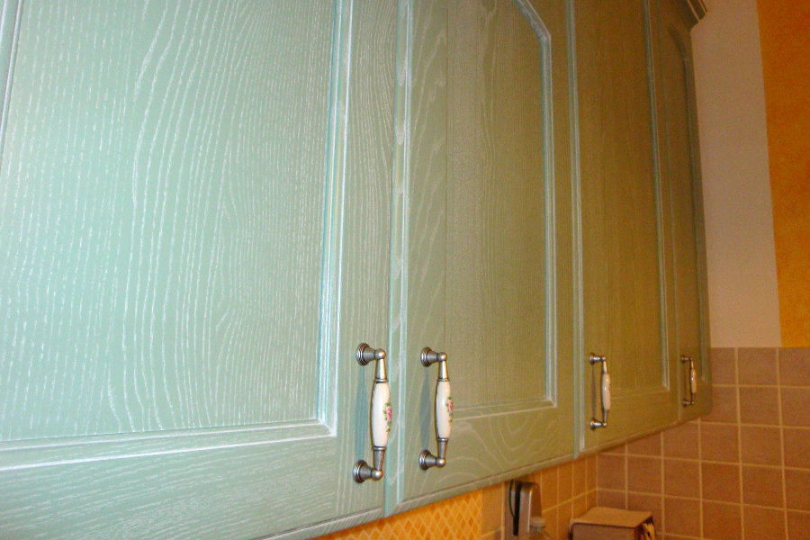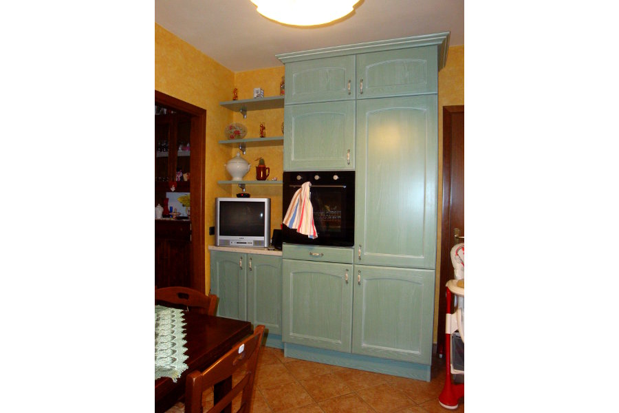 Realizzazione su misura di una cucina classica laccata decapata, in una tonalità di celeste molto delicata.