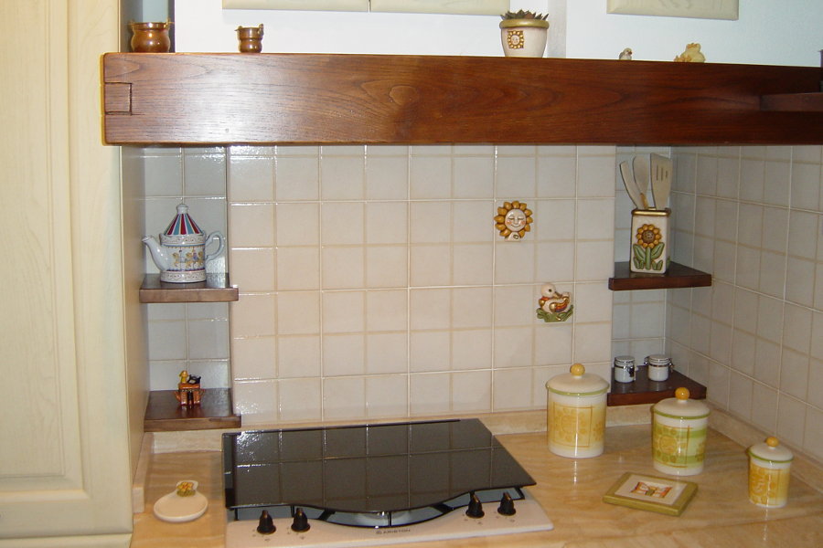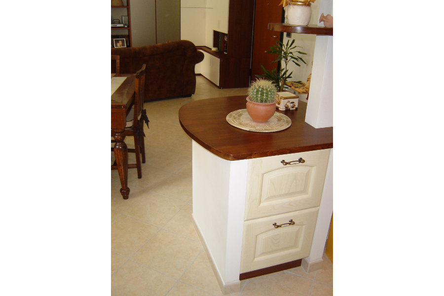 Abbiamo operato con interventi in finta muratura, con la realizzazione del pensile sottocappa, con la realizzazione su disegno del bancone e delle mensole in legno massello e riproponendo le stesse ante di serie, tutto rigorosamente su misura.