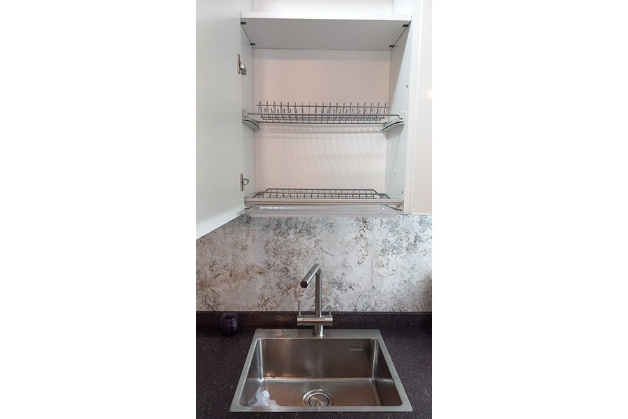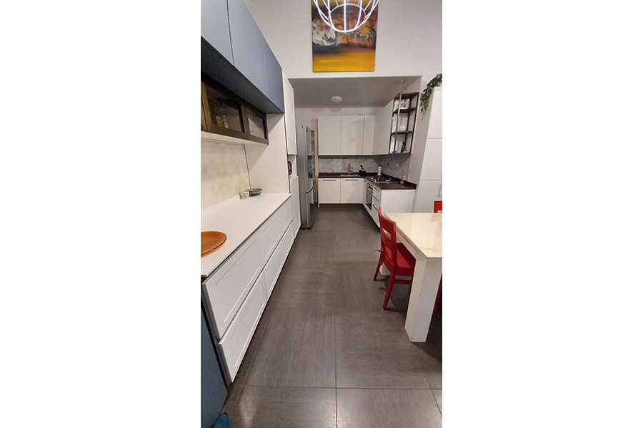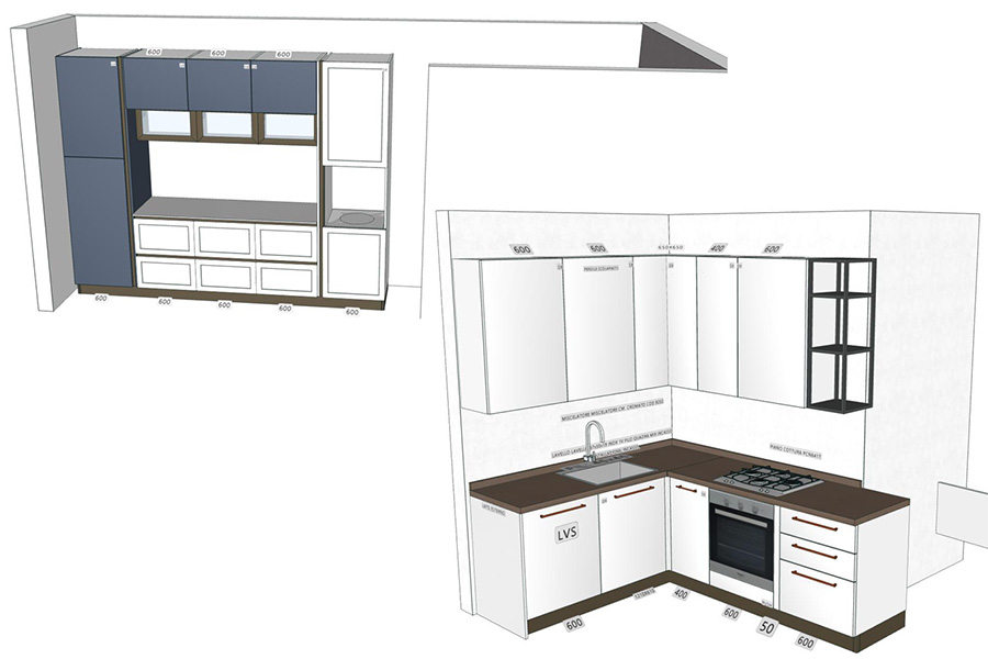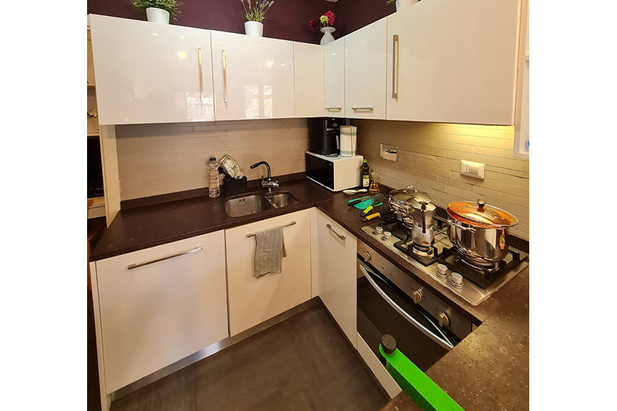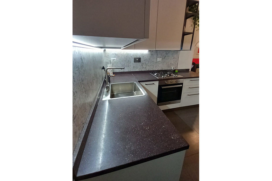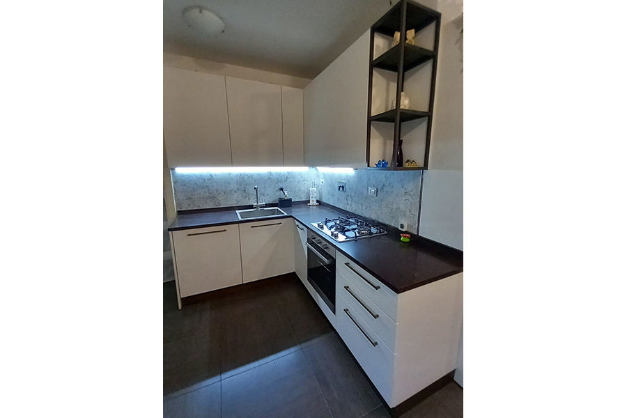 Della vecchia cucina è stato riutilizzato il piano top, che era in agglomerato di ottima qualità, tagliandolo ad L per riadattarlo alla nuova cucina.