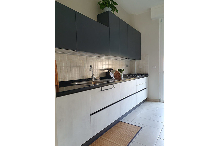 I colori di zoccolo e gole, sono stati scelti in finitura antracite opaco per abbinarsi alla perfezione al colore dei pensili.