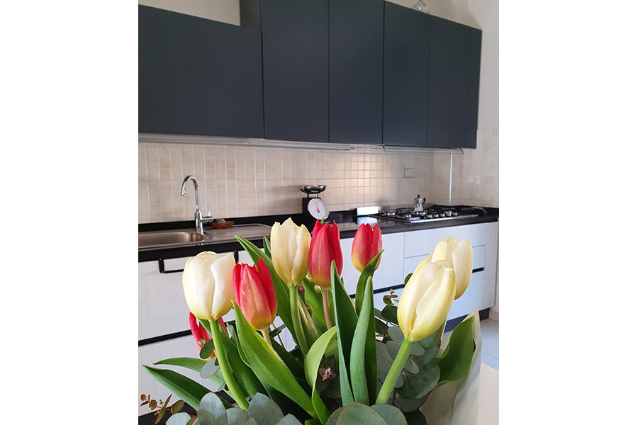 Infine, il piano top è stato scelto in agglomerato di quarzo, materiale molto resistente in cucina: sul lato destro del muro era presente un “dente”, per questo motivo il top è stato sagomato a misura.