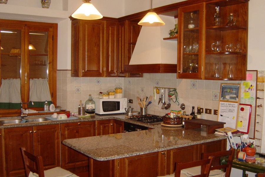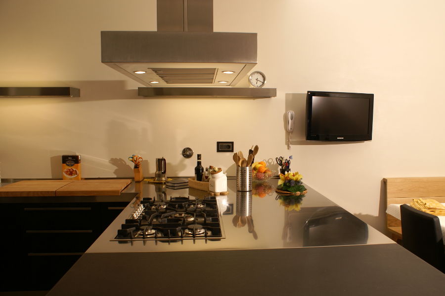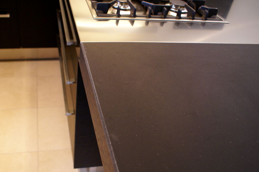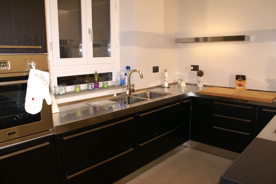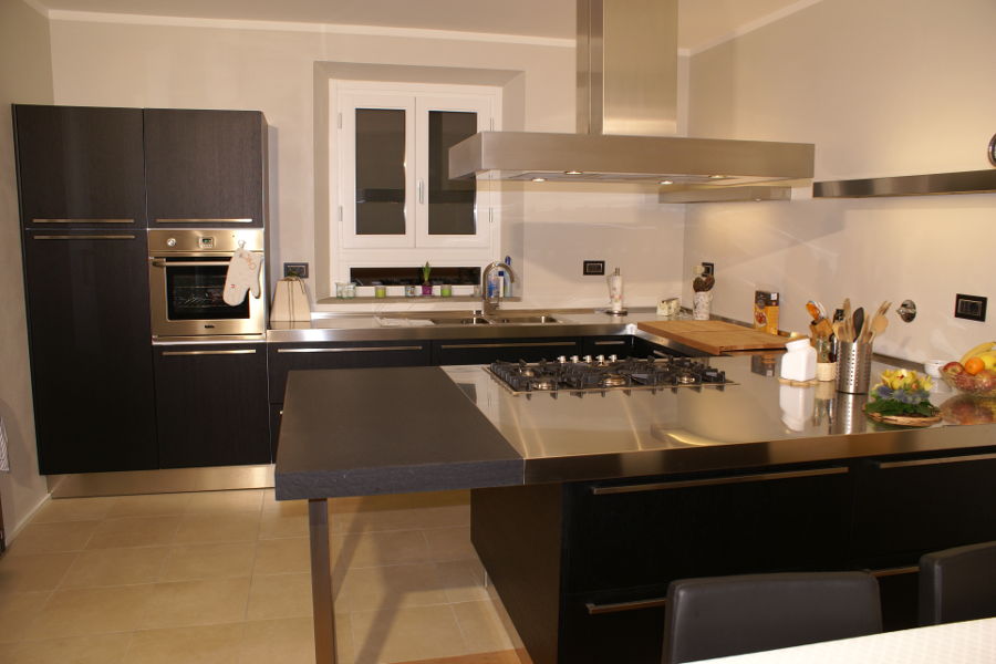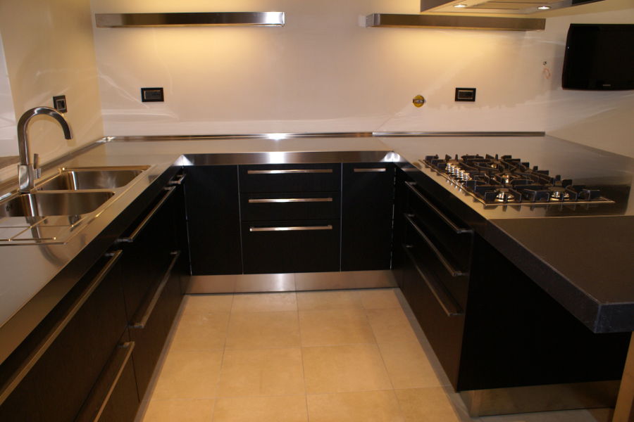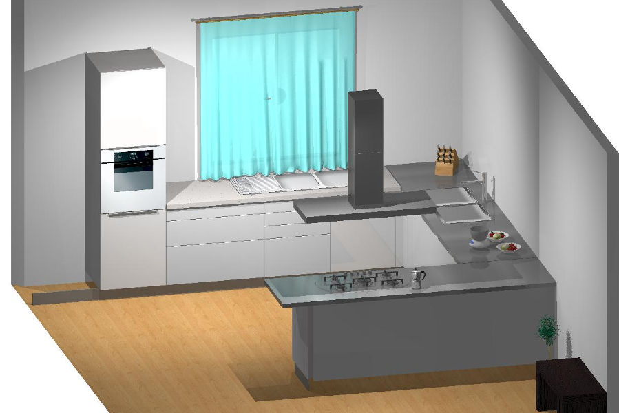 Cucina dalle linee moderne con bancone eseguito su misura in Stone, un particolare agglomerato di quarzo, materiale resistente al calore e agli agenti chimici, pratico da pulire e asciugare. Il bancone aumenta lo spazio d’appoggio utile. La realizzazione al computer risulta estremamente fedele alla realizzazione vera e propria. Lapi Arredamenti studia la soluzione più pratica per le tue esigenze.