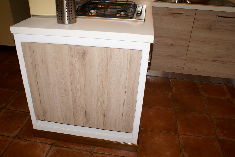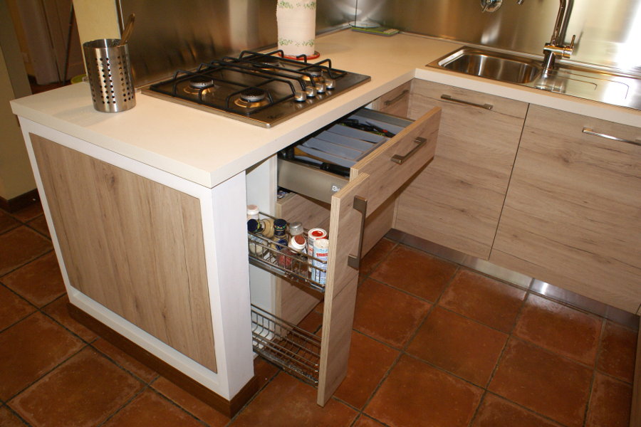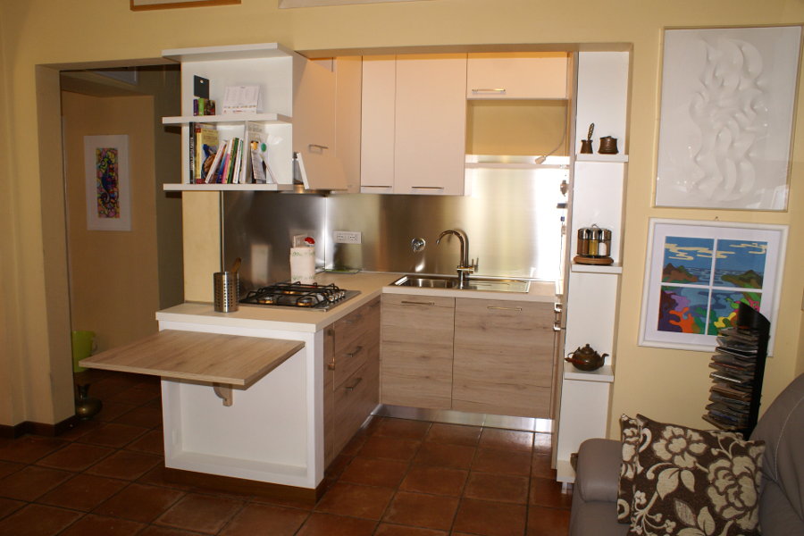 La terza è lo studio degli spazi in ottica “salvaspazio”, avendo la possibilità di avere tutti gli elettrodomestici, compresa la lavastoviglie, a portata di mano, e avere comunque la disponibilità di molti piani d’appoggio per poter lavorare.