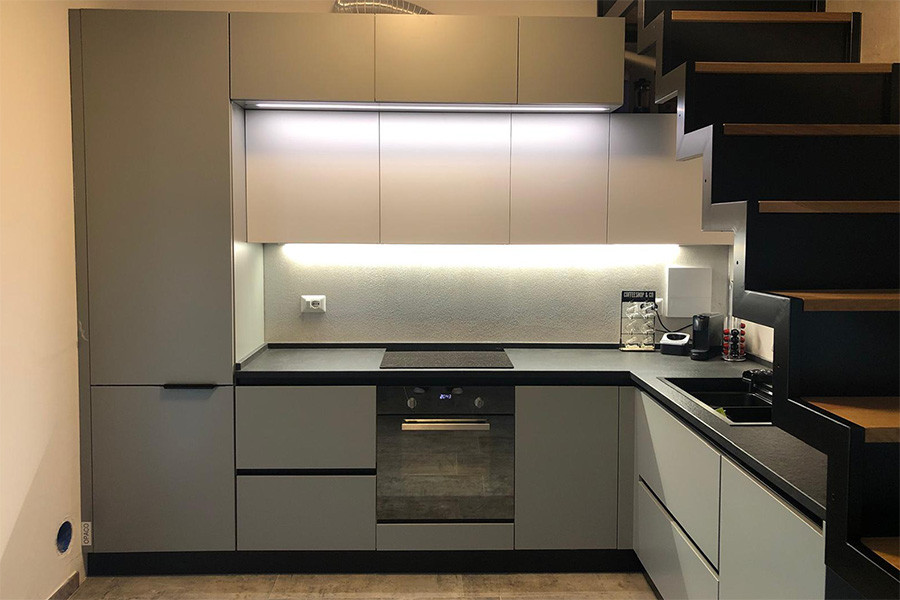 In questo caso, abbiamo progettato lo spazio in base alla scala esistente ed i pensili sono stati previsti con doppia altezza per dare movimento.
