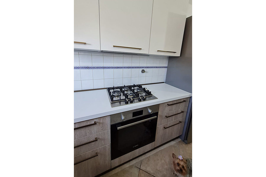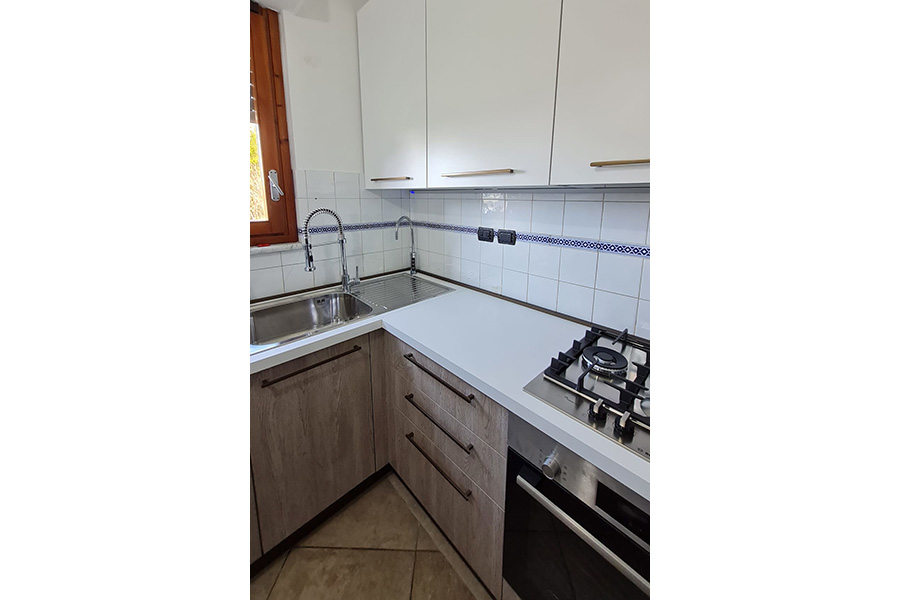 Il cliente infatti ci ha contattato per progettare una nuova cucina moderna, cercando di acquisire spazio rispetto a quella vecchia: abbiamo quindi eliminato la colonna del forno che prendeva troppo posto, ed anche un muretto che fungeva da divisorio.