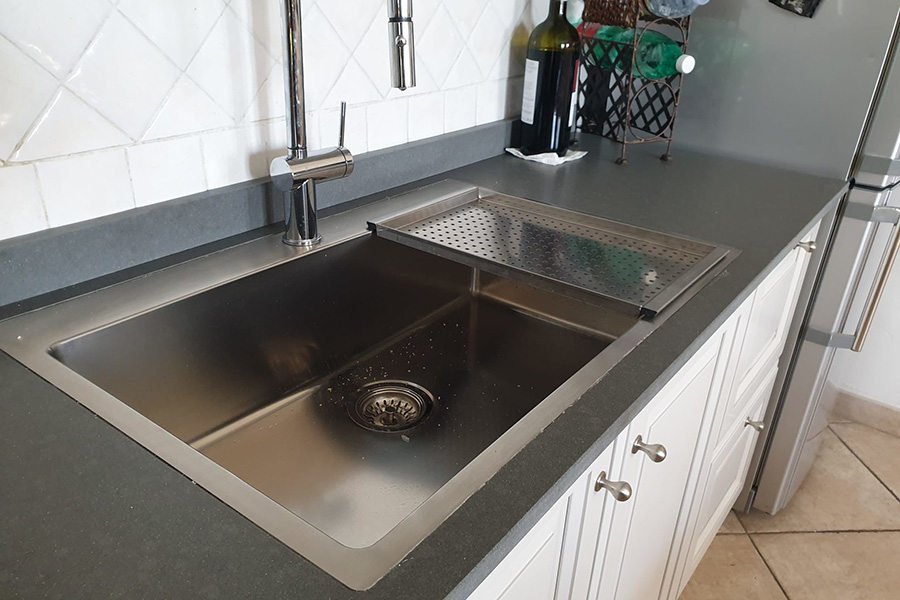 Abbiamo cambiato il piano top, sostituendolo con un piano in agglomerato di quarzo marrone; il lavello è stato sostituito con un modello in acciaio inox a vasca unica.
