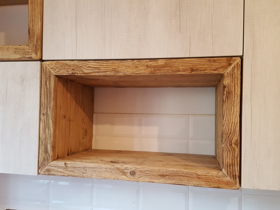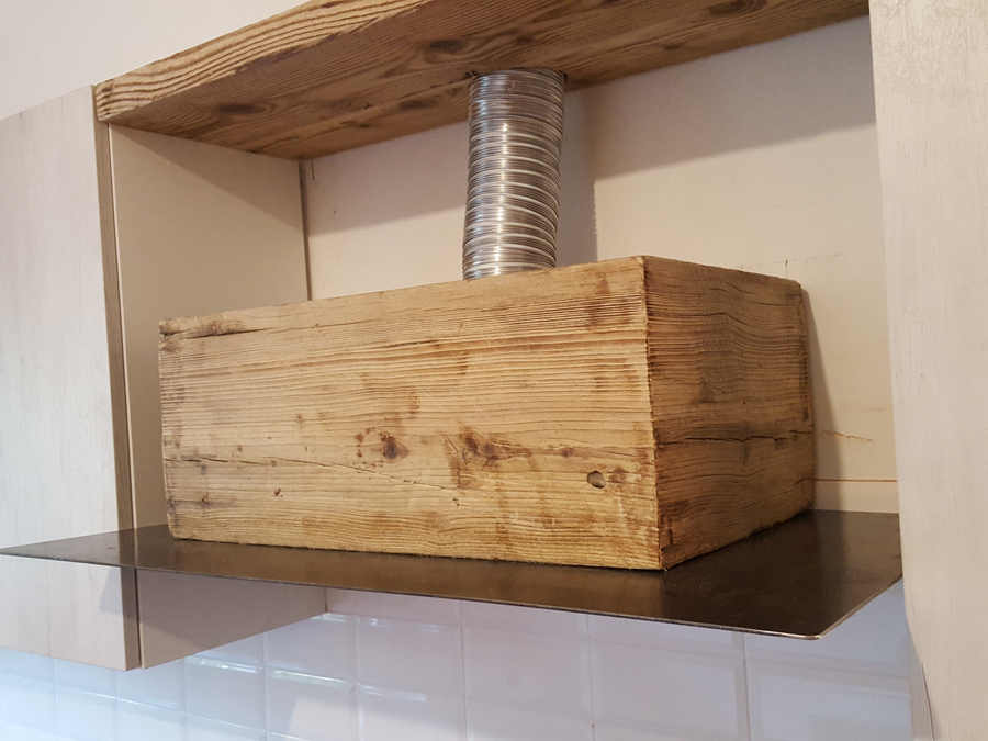 La cappa aspirante è realizzata anch’essa con legno vecchio recuperato e restaurato.