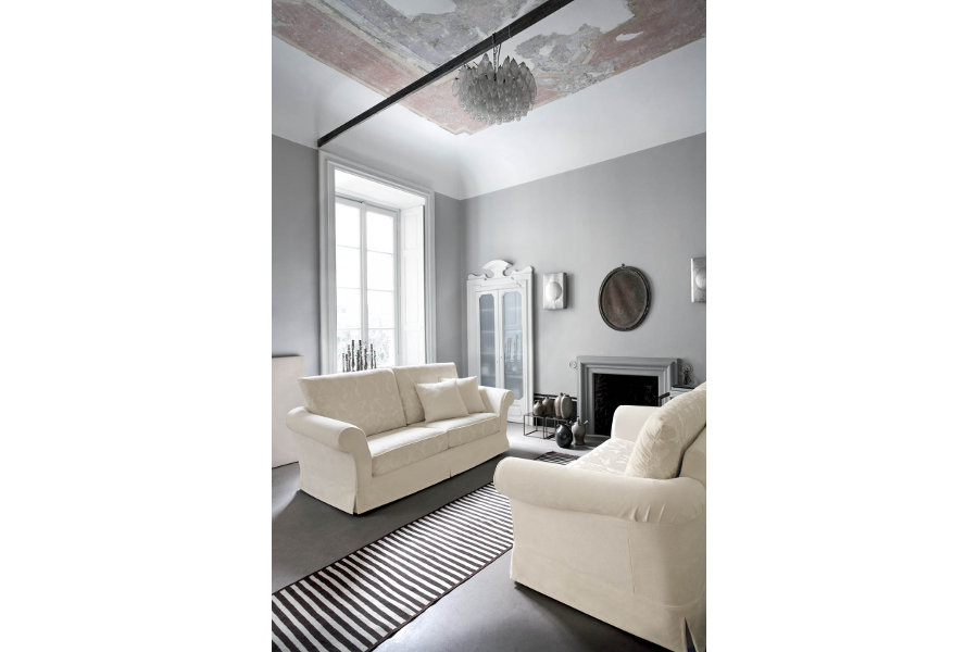 L’eleganza dello stile classico è racchiusa in questo divano classico 2 posti, con rivestimento completamente sfoderabile, struttura in massello di legno e agglomerato rivestito in poliuretano espanso e vellutino accoppiato, supporto di seduta con cinghie elastiche intrecciate, imbottitura in poliuretano espanso e fibra di poliestere, braccioli in fibra di poliestere.
