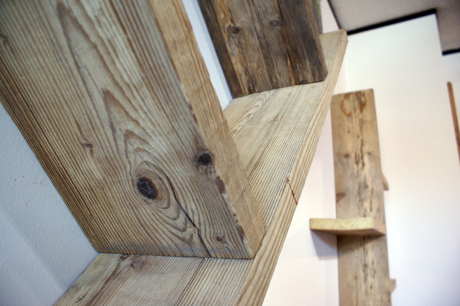 Libreria in legno di recupero a giorno, realizzata su misura.