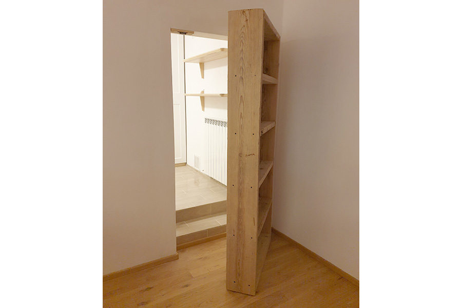 Per sfruttare anche l’accesso ad un vano armadio, il cliente ci ha chiesto una soluzione per sfruttare anche questo spazio al meglio, ed ecco che la libreria in legno di recupero dalle linee semplici, diventa simpaticamente il nascondiglio per un vano segreto!