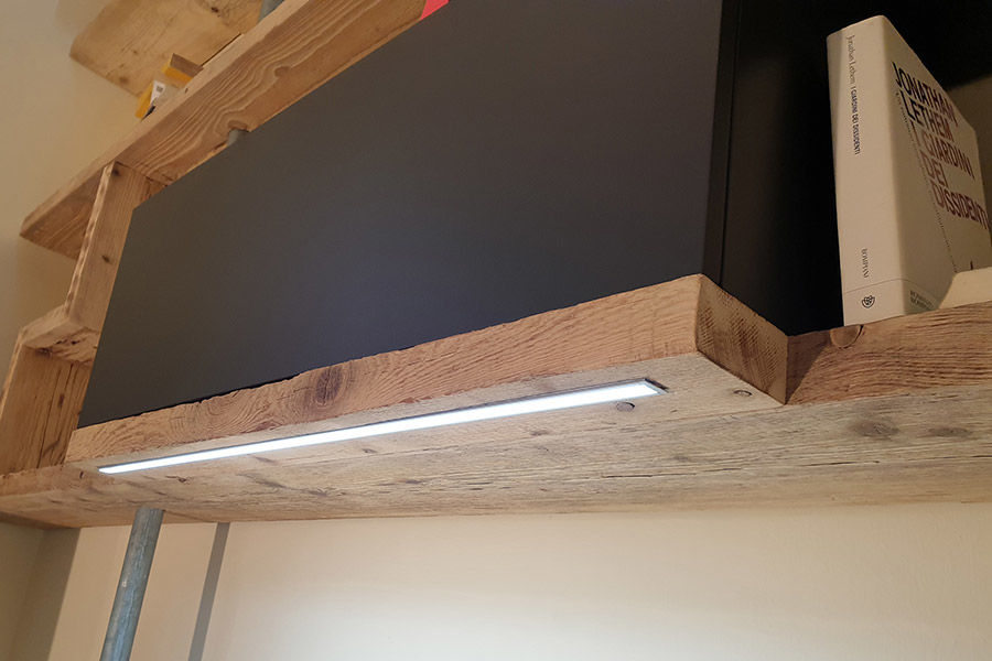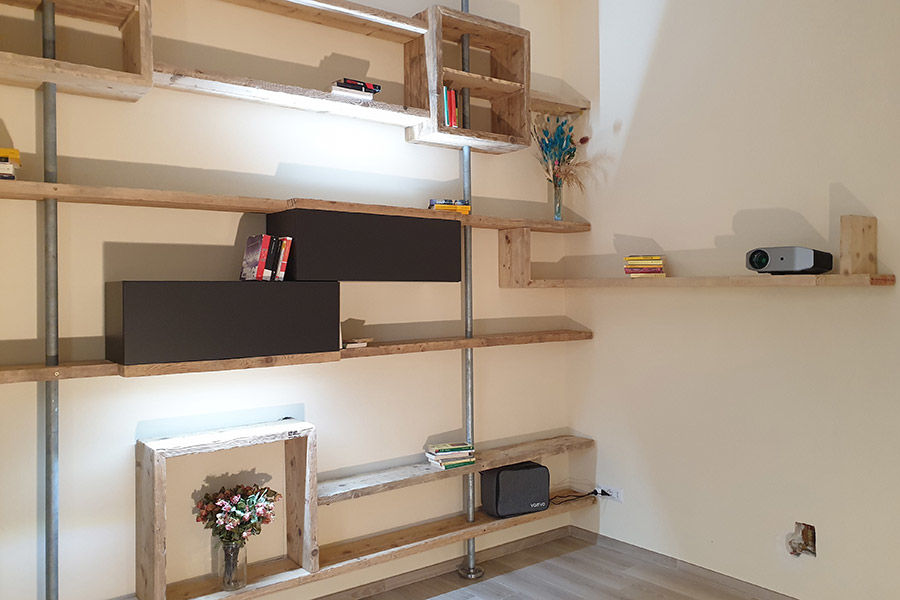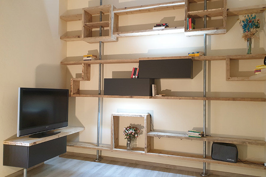 Questa parete attrezzata in legno di recupero ci è stata commissionata da una coppia che aveva delle necessità da rispettare: la parete da attrezzare infatti non poteva essere in alcun modo forata per installare tasselli o punti di aggancio.