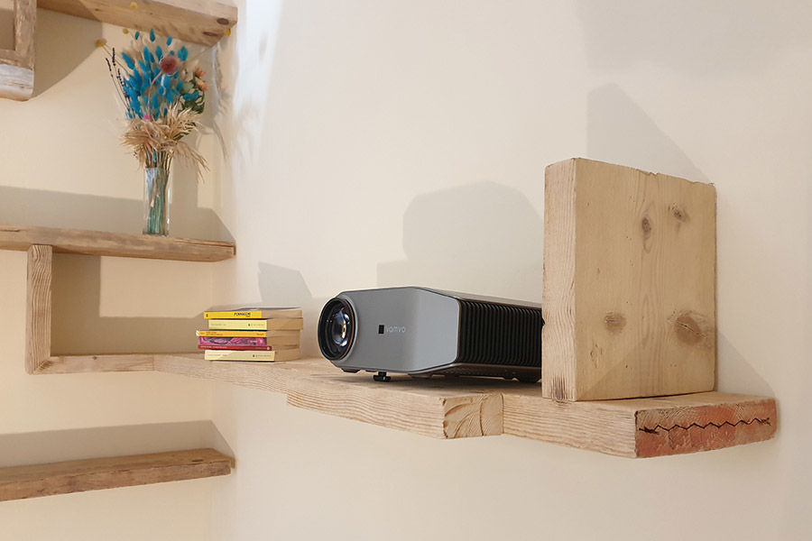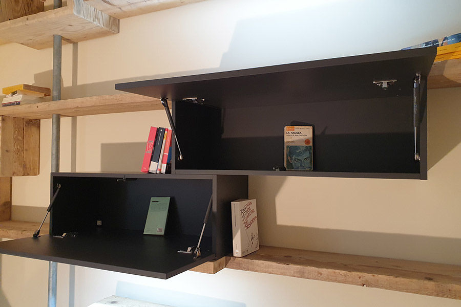 Il progetto proposto e accettato prevede un ancoraggio alla parete di destra e di sinistra ed i tubi di acciaio che dal soffitto arrivano a terra, rendendo quindi la libreria centrale completamente sospesa.