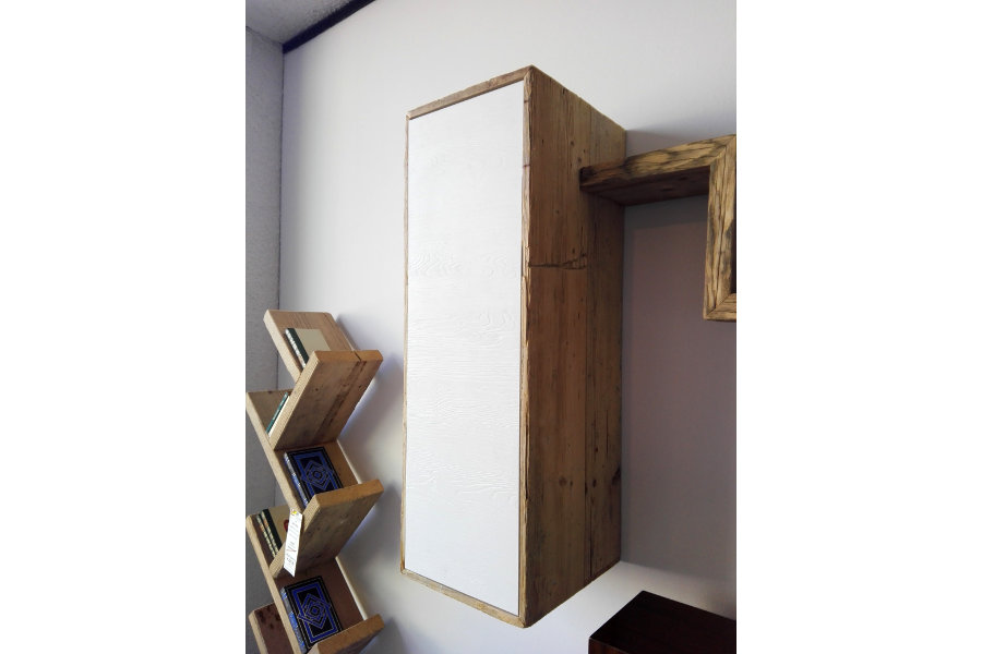 Spazioso pensile in legno di recupero con anta, realizzato su misura.