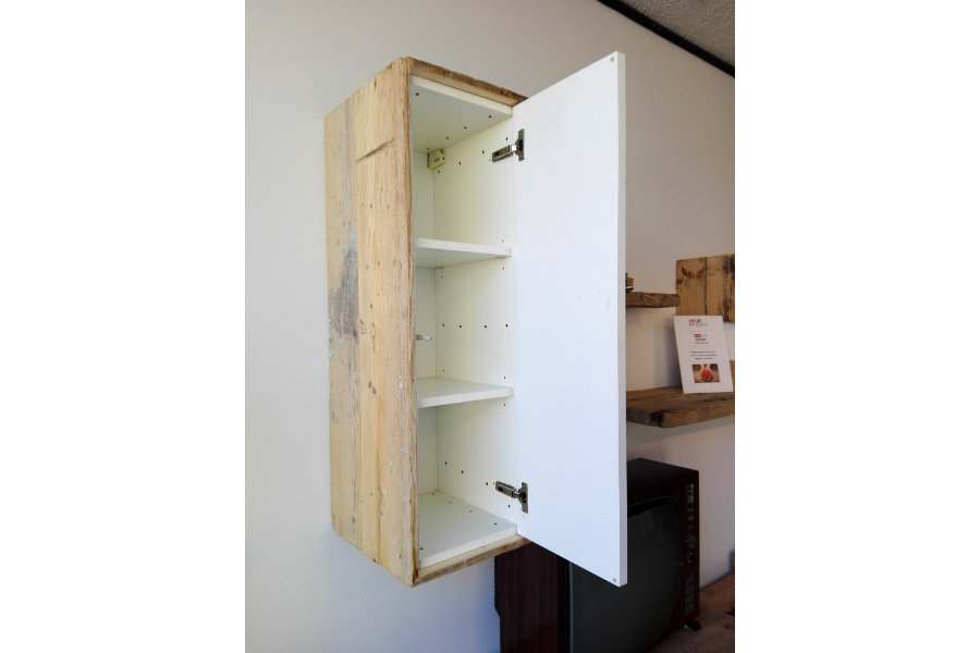 La struttura del pensile è in legno vecchio recuperato e l’interno in laminato.