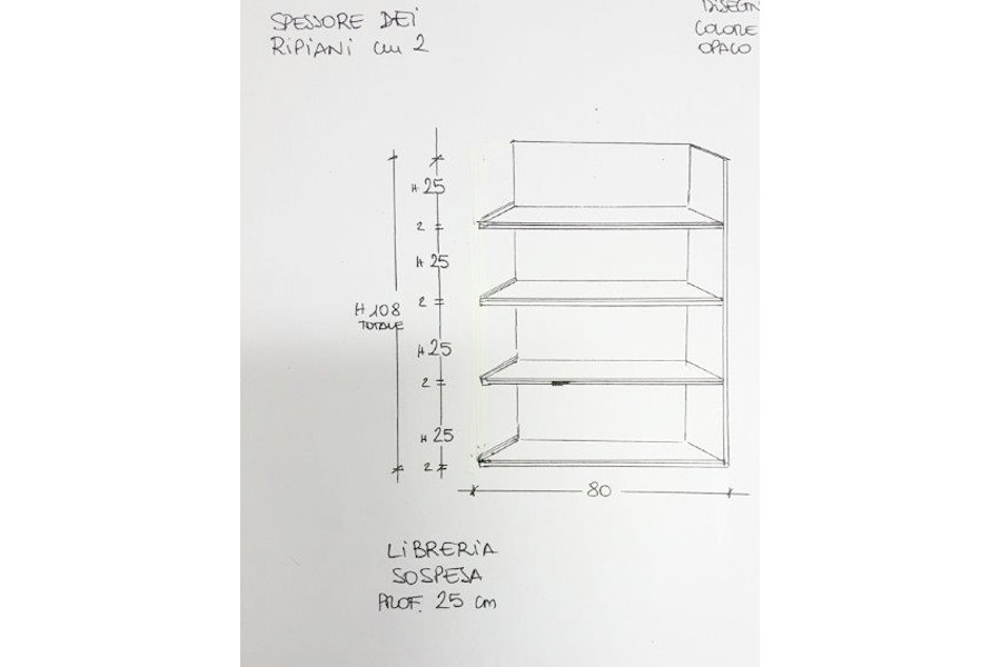 È formata da ripiani di 2 cm ed è di colore bianco laccato opaco, da campione cliente.