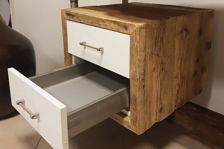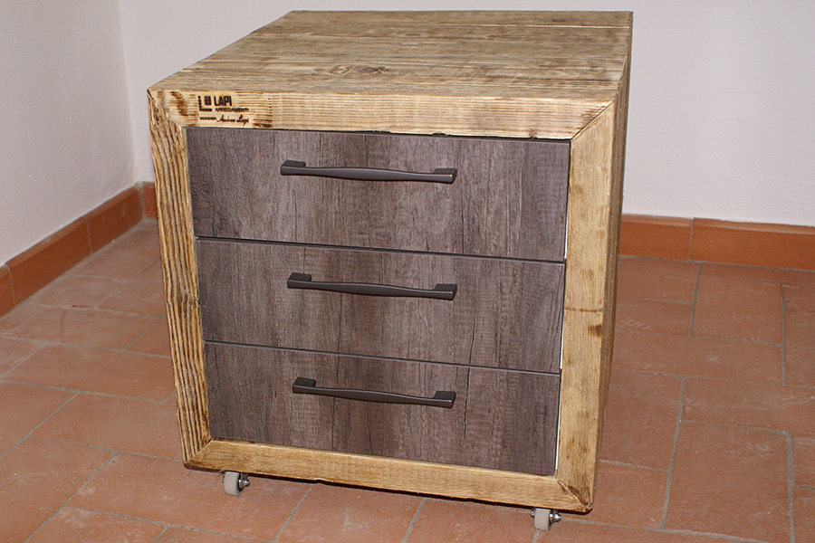 La seconda cassettiera è un esempio di abbinamento tra legno di recupero e laminato bianco: accostamento particolare ma molto gradito dai nostri clienti. 2 cassetti, maniglie in ferro. Clicca qui per verificare la disponibilità ed acquistare.