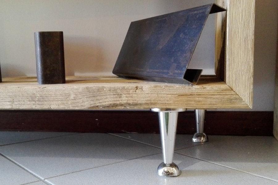 Questo porta TV in legno di recupero è realizzato su misura. Ha quattro piedini in acciaio, ma è disponibile con altri tipi di piedini.