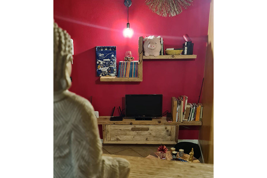 Realizzato in un primo momento semplicemente con un ripiano per la televisione ed una mensola, tutto ancorato al muro, senza supporti a terra.