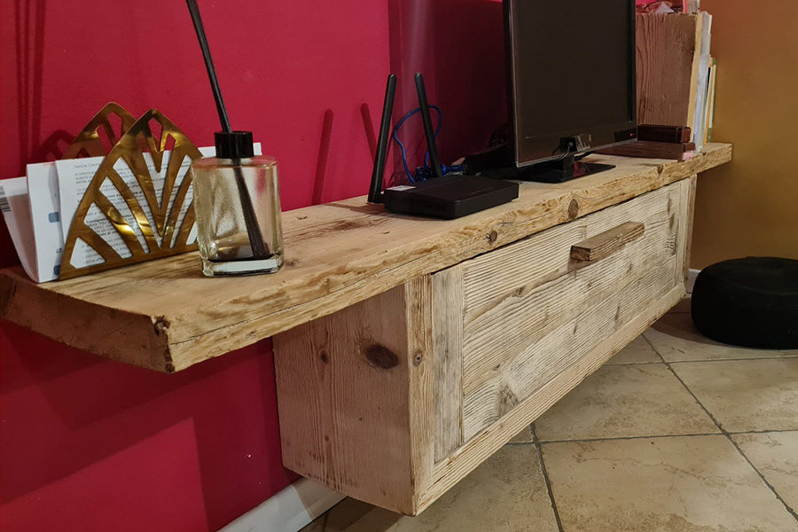 La cliente ci ha richiesto un porta TV in legno vecchio, molto semplice, e dalle dimensioni ridotte in quanto la parete non è particolarmente lunga.