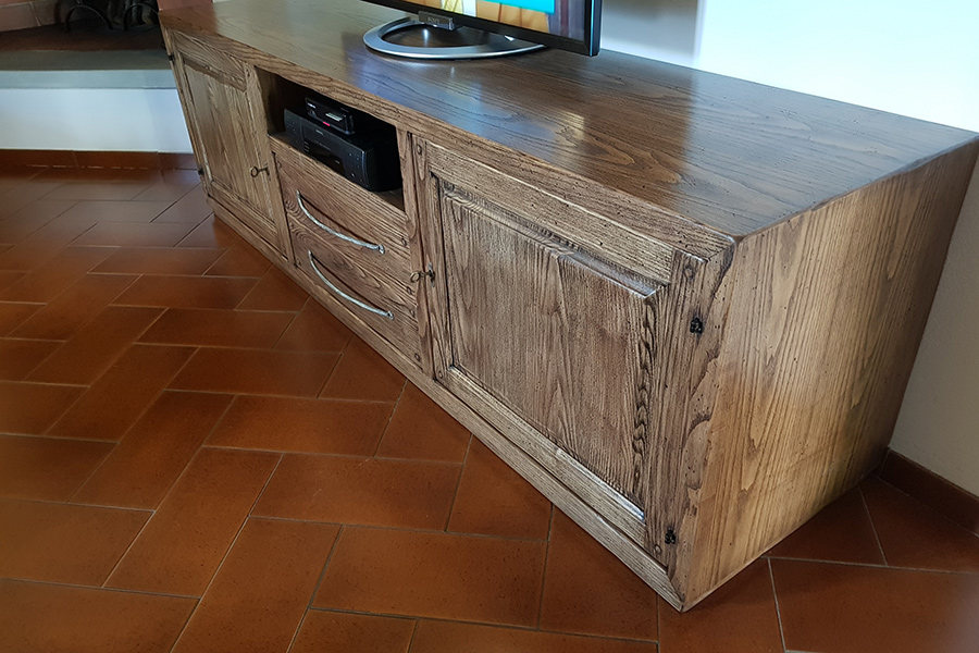 Questo Porta-tv X-Wood in castagno è stato realizzato su misura e segue perfettamente lo spazio disponibile di questa parete.