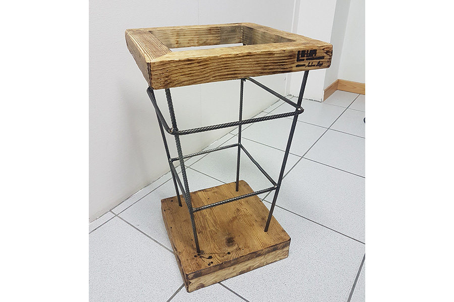Questo portaombrelli in legno di recupero e tondino in ferro è stato realizzato con materiale che solitamente viene utilizzato in edilizia.