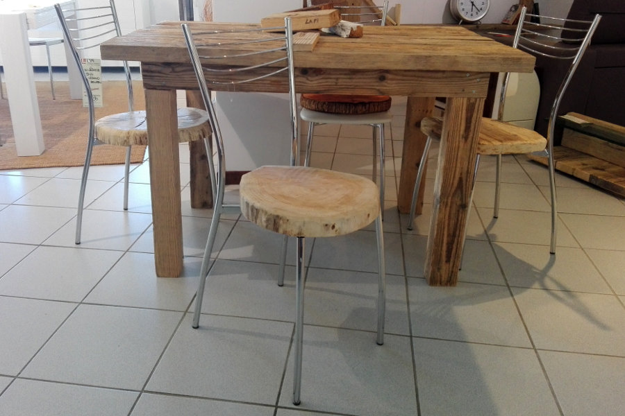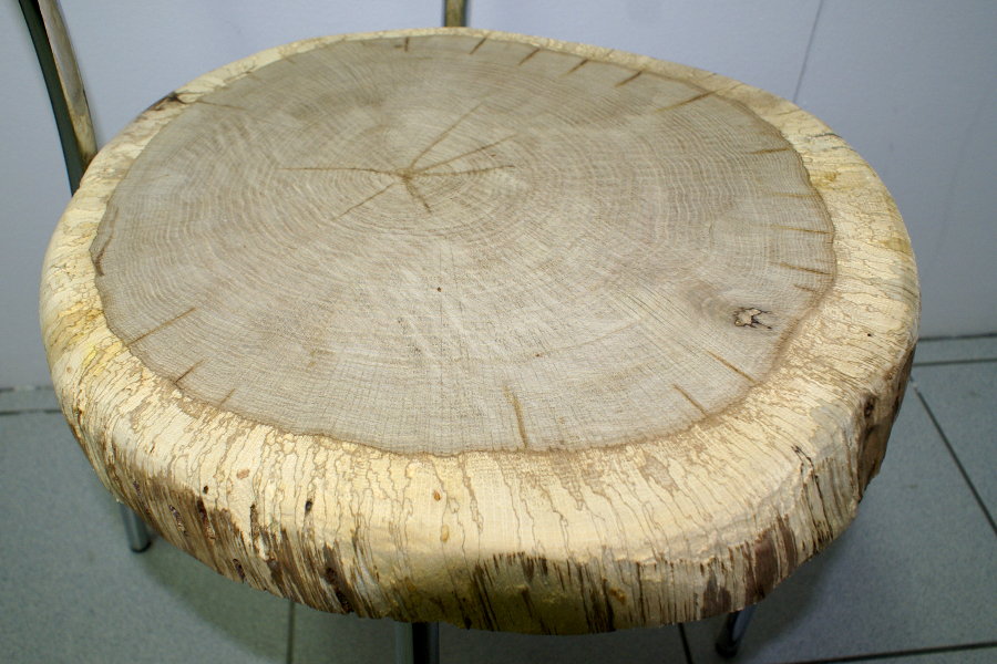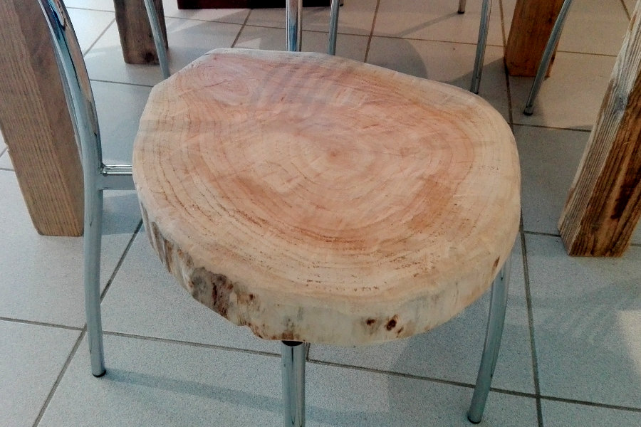 La sezione di tronco che costituisce la seduta è ricavata da diversi tipi di legno (pioppo, quercia, abete) con taglio netto.