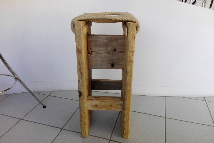 Originale sgabello in legno di recupero e corda, realizzato su misura in legno di abete.