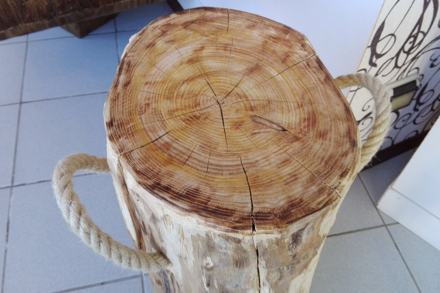 Lo sgabello ha anche un poggiapiedi e due piccoli manici in corda.