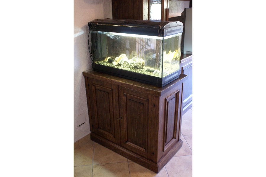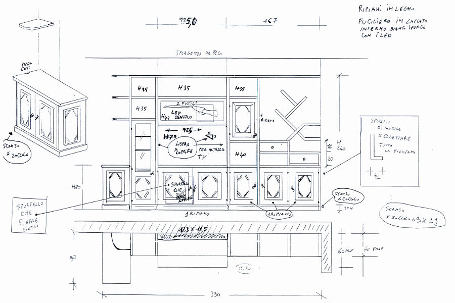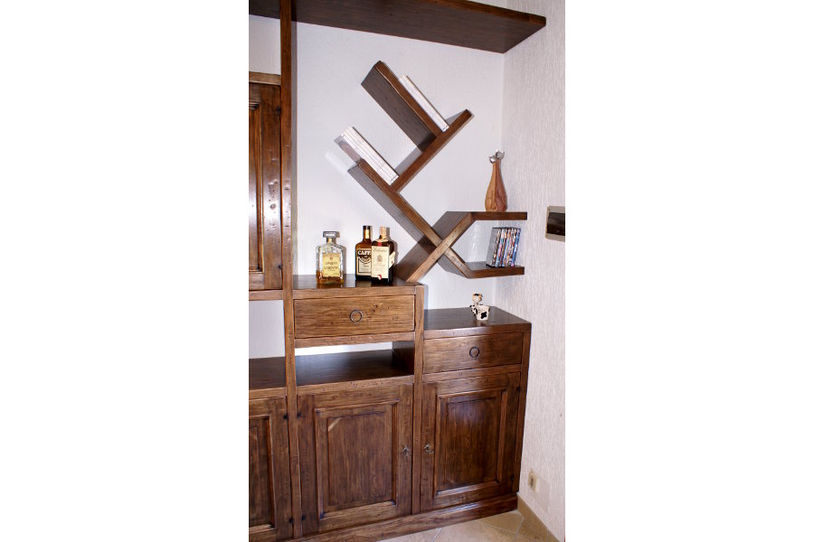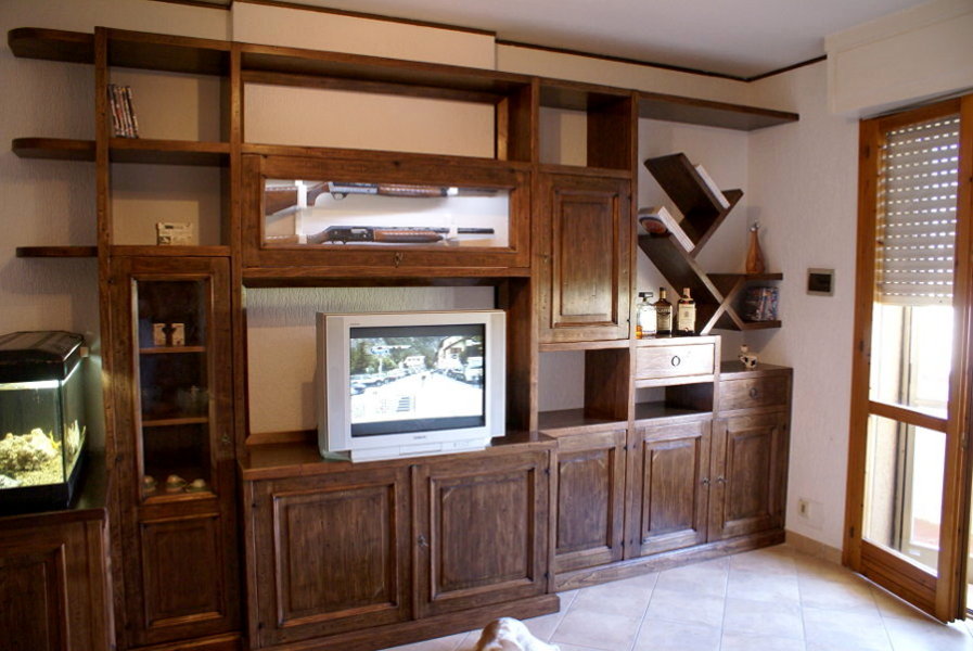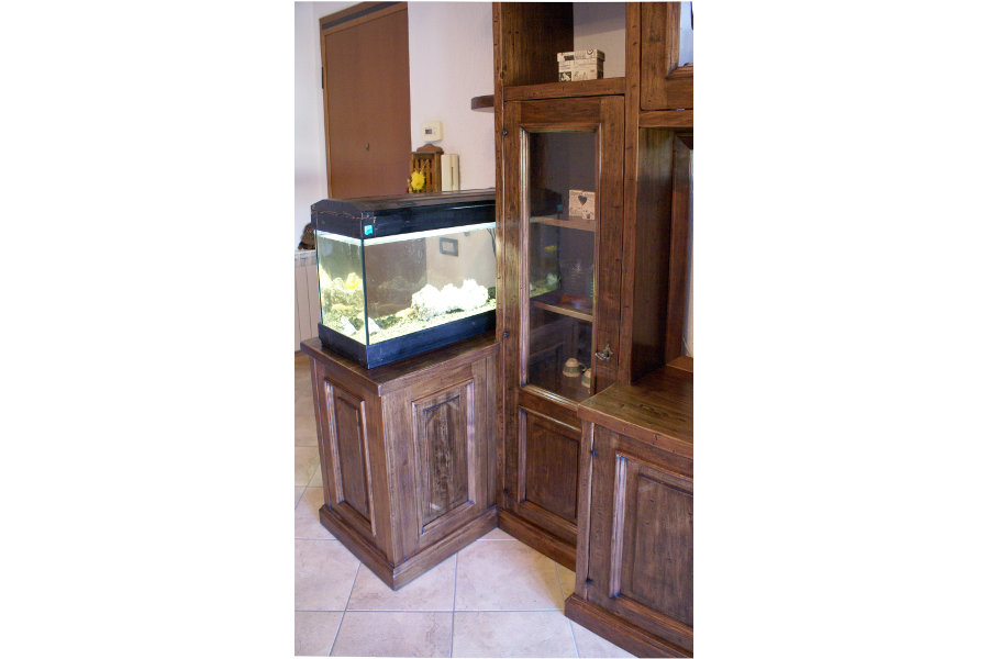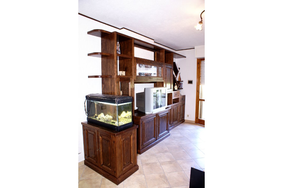 Soggiorno classico in massello realizzato su misura con particolare attenzione all’inserimento dell’acquario e della fuciliera. La larghezza di questo soggiorno è di circa 3,9 metri, per un’altezza di 2,4 metri, ma è realizzabile interamente su misura per la tua stanza, anche con una finitura diversa.