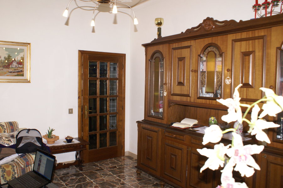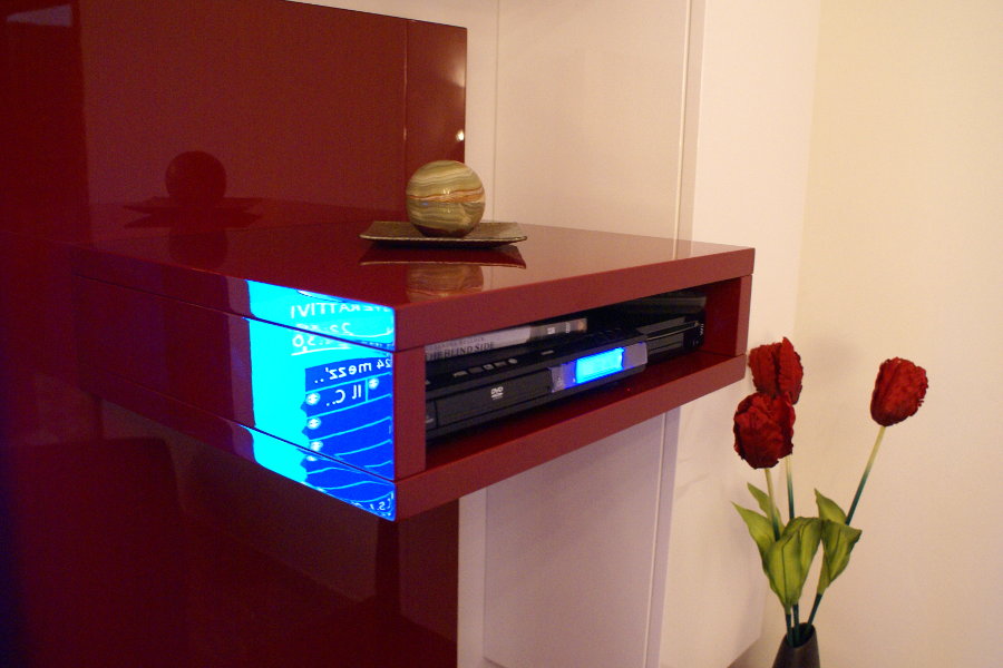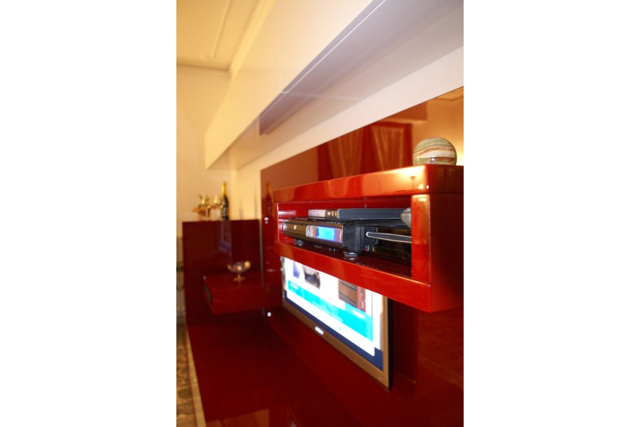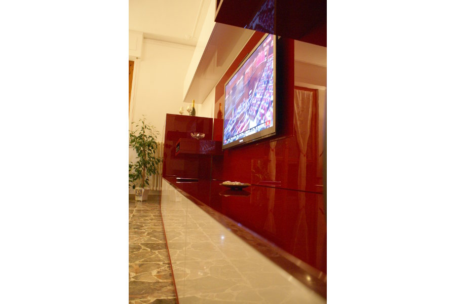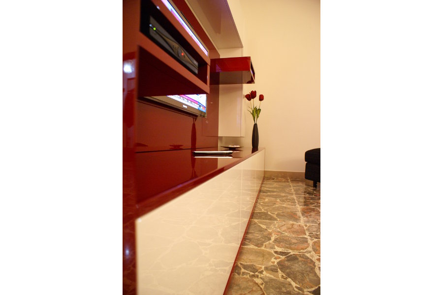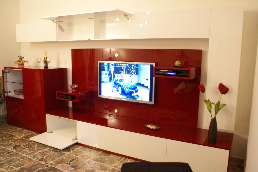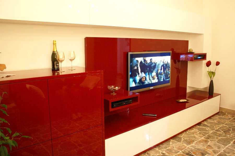 Soggiorno su misura componibile, dal taglio moderno, laccato lucido bianco e ciliegia, con pannello porta televisore. Questa composizione ha una larghezza di circa 3 metri, ma è interamente ricreabile su misura. Realizziamo la composizione per arredare il tuo soggiorno nel colore che preferisci, con possibilità di inserire ulteriori cestoni.