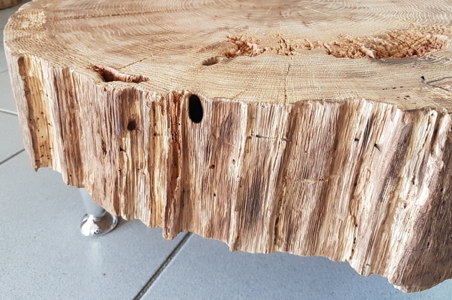 Ricavato da un tronco e con l’aggiunta di piedini in metallo, questo tavolino in legno di recupero misura 73 cm x 63 cm ed è alto 26 cm, ma può essere realizzato su misura per te.